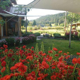 Our location is on 12.6 acres of land on the Little Applegate River. The property is home to a small winery and tasting room, Wild Wines, and residents. The wedding ceremony location is perched above the river under the shade of large cedar and oak trees, but you may also choose your preferred location anywhere on the property. The celebration area is around the winery where the bar and bathroom can be accessed and where food service and seating can be set up, as well as electricity. As we are primarily an outdoor venue, we ask that you please keep this in mind before requesting to connect. Depending the time of year, you may require a tent for shade or rain protection. This is not something we provide, but we are happy to refer you to local outfitters. The main indoor area is the tasting room, seen in photos, which is best suited for the bar area, hors d'ouevres, gifts, cake service. Some of the outdoor area has shade available.