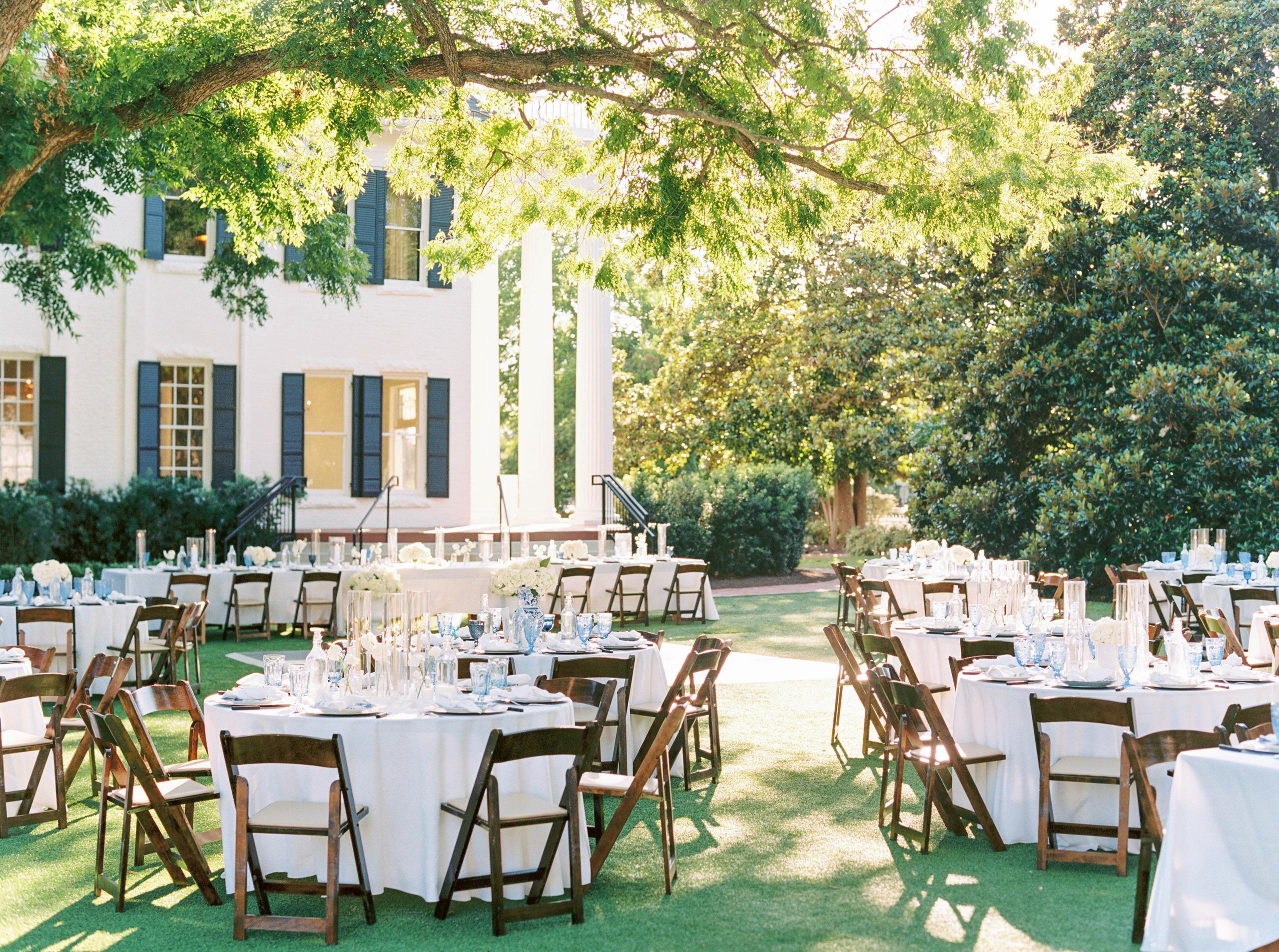 This picturesque outdoor ceremony space is set directly on the pristine, manicured lawn of the historic estate. Framed by the mansion's stately white columns, elegant dark shutters, and a magnificent, mature shade tree, the setting exudes classic, timeless romance. Dark wooden chairs create a beautiful contrast against the vibrant green grass, leading up to the grand brick steps that serve as a natural, elevated altar. This sun-dappled, open-air location provides an effortlessly elegant and breathtaking backdrop for you to exchange your vows in true, stately style.