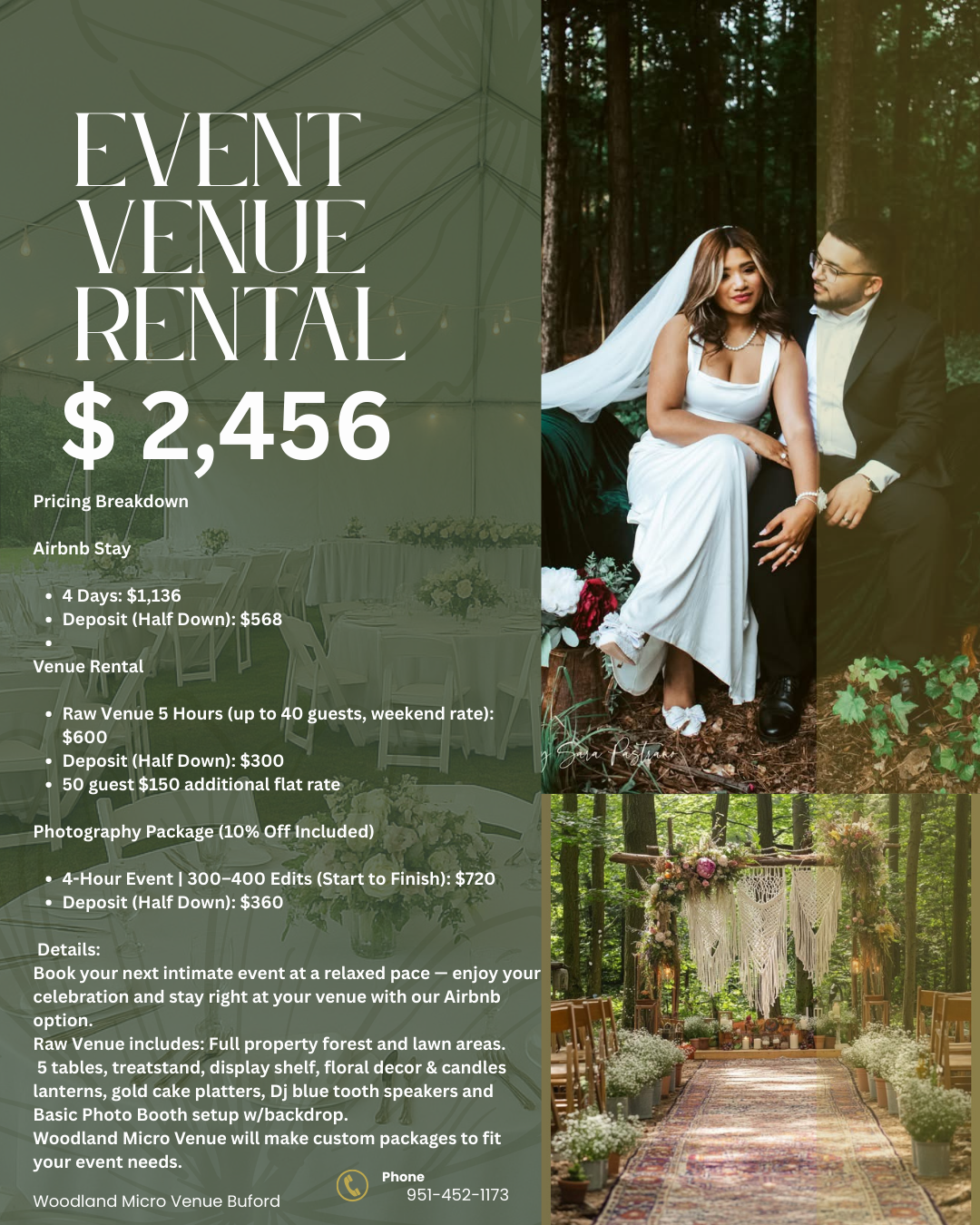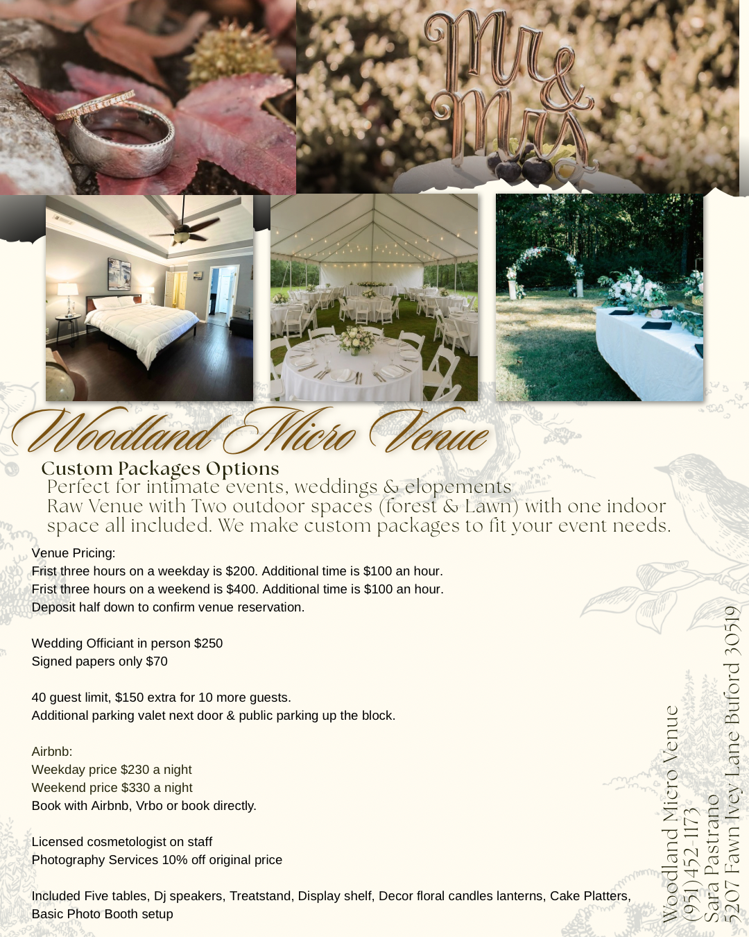 We recently used this venue for the wedding of our son! The date he chose was a little more rushed then we had expected but thankfully, the venue was able to accommodate us all on somewhat short notice. The owner and main proprietor, Sara P, walked us through the whole process expertly we felt, and communicated with us ongoingly through through the whole experience. She and her staff handled our needs and our anxieties. The setting itself felt magical: an acre of land in Northern Gwinnett County in a quiet residential area: a beautiful house and a well landscaped backyard surrounded by a deep forest of pine , cypress, and oak trees, in which we saw in the distance, a family of deer! This was the best site of the five we looked at, and it met all of our expectations: a romantic setting, we felt!