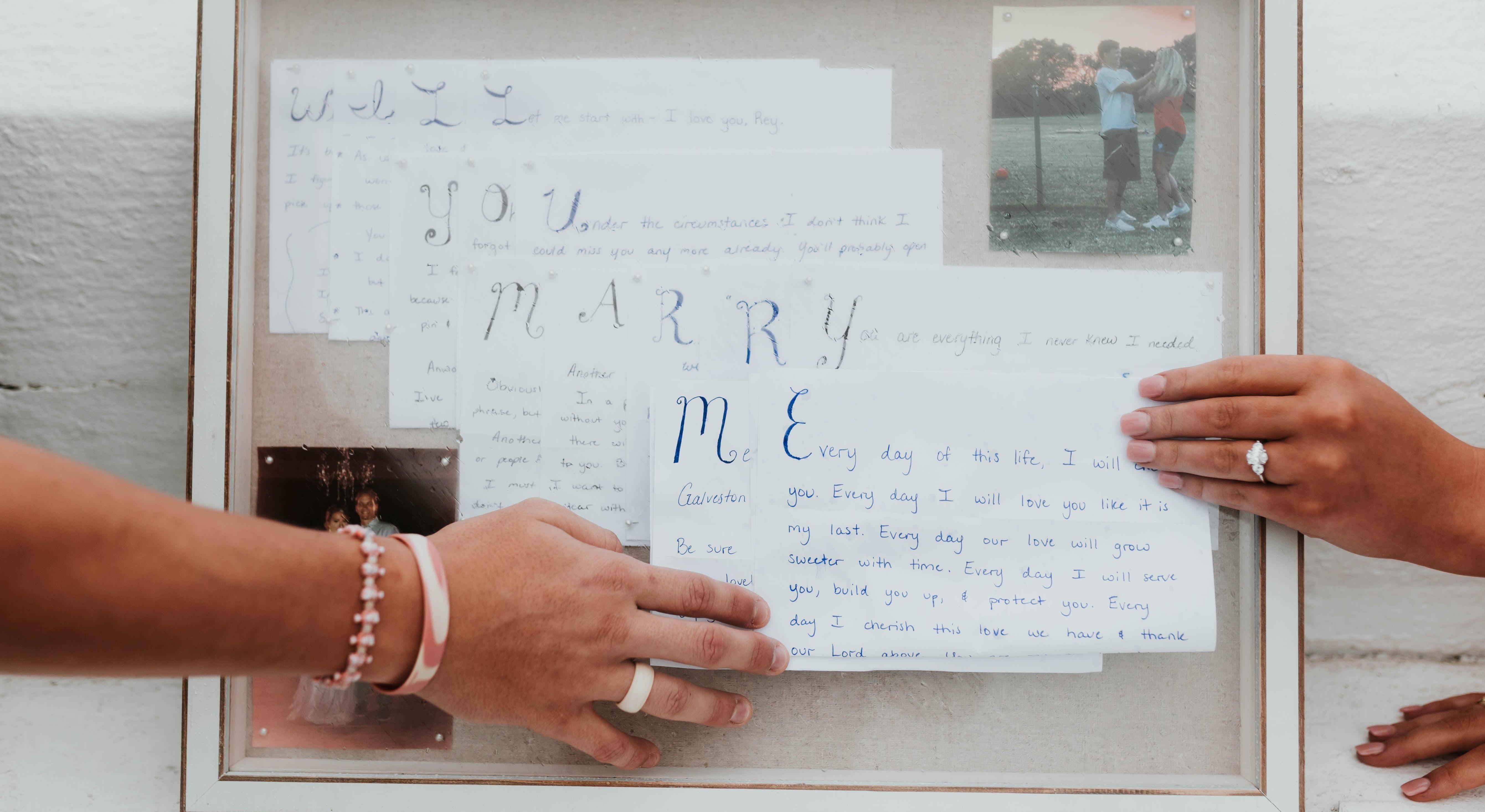 In our last semester of college and 3 years of dating, Clayton accepted a job offer in Reno, Nevada. During his two years in Nevada, Clayton began writing encoded letters that were slowly asking me to marry him. Thankfully, I kept every single letter and my stealthy friends helped retrieve the letters a few days before the proposal. On March 16, 2020, Clayton planned us a night away in Galveston and asked me to take pictures on the beach before dinner. He brought me to a beautiful white stage on the Seawall, offered me an 'Extra' stick of gum (the commercial is how we got our song) and got down on one knee. Of course, I said YES to my best friend and turned around to find a random "tourist" snapping some pictures of our special moment. It was our photographer that he hired! Just when I thought the surprises were over, in front of the stage was a shadow box of all the letters he used to ask me to marry him and a Taco Bell packet saying "Marry Me"! Our journey to being the Future Mr. & Mrs. Webb has been so incredible and we cannot wait to celebrate with you!