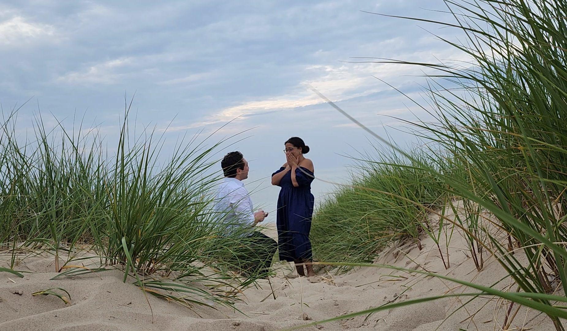 Vivian had just been promoted and attended an out of town conference. Naturally John wanted to treat her to a nice vacation where she didn't have to think about anything except one very important, life-changing decision. They went to get pizza by the beach, wine tasting, and out to a fancy dinner; all ending with a nice walk along the shore. He got down on one knee and she said yes! (They also got ice cream afterwards.)