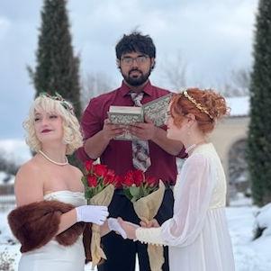 Sophia has had the pleasure of being Aislyn’s sister for 21 years. Aislyn is responsible for all of Sophia’s weirdest interests, and her ability to sing every song from “Hamilton” top to bottom. She is a full time hairdresser, cat-mom to Tinkerbell and Pinky, and is overjoyed to see her sister spend their life with someone so perfect for them.