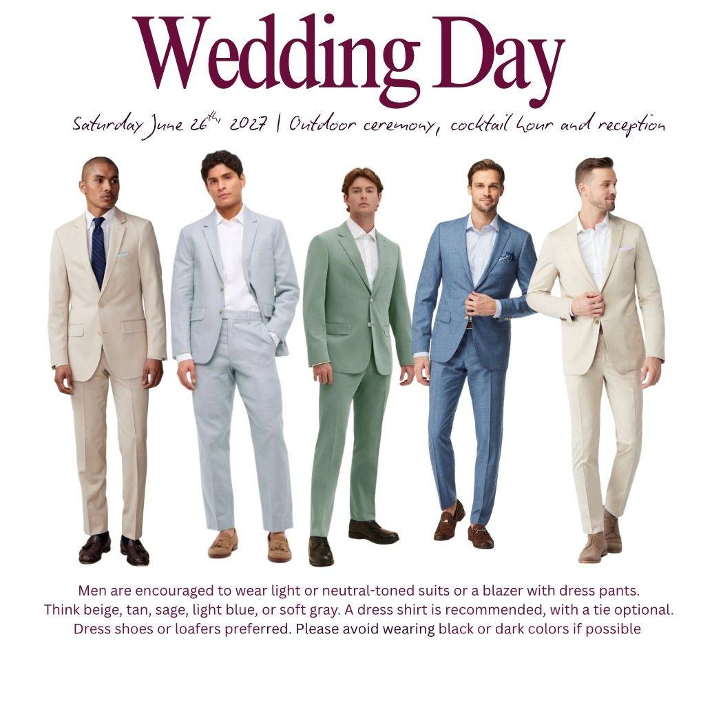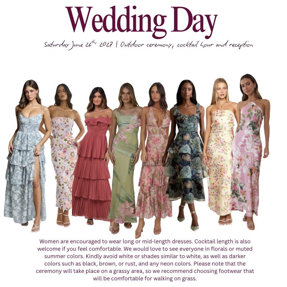This page outlines everything you need to know about our wedding dress code! This includes our wedding party colors, inspiration for guest, and a few colors and patterns we kindly ask guest to avoid. We invite everyone to dress in Semi Formal / Garden Party Formal wear. Please wear whatever you are comfortable with, these are just our wishes and preferences. Thank you for helping us bring our celebration together- we cant wait to celebrate with you!