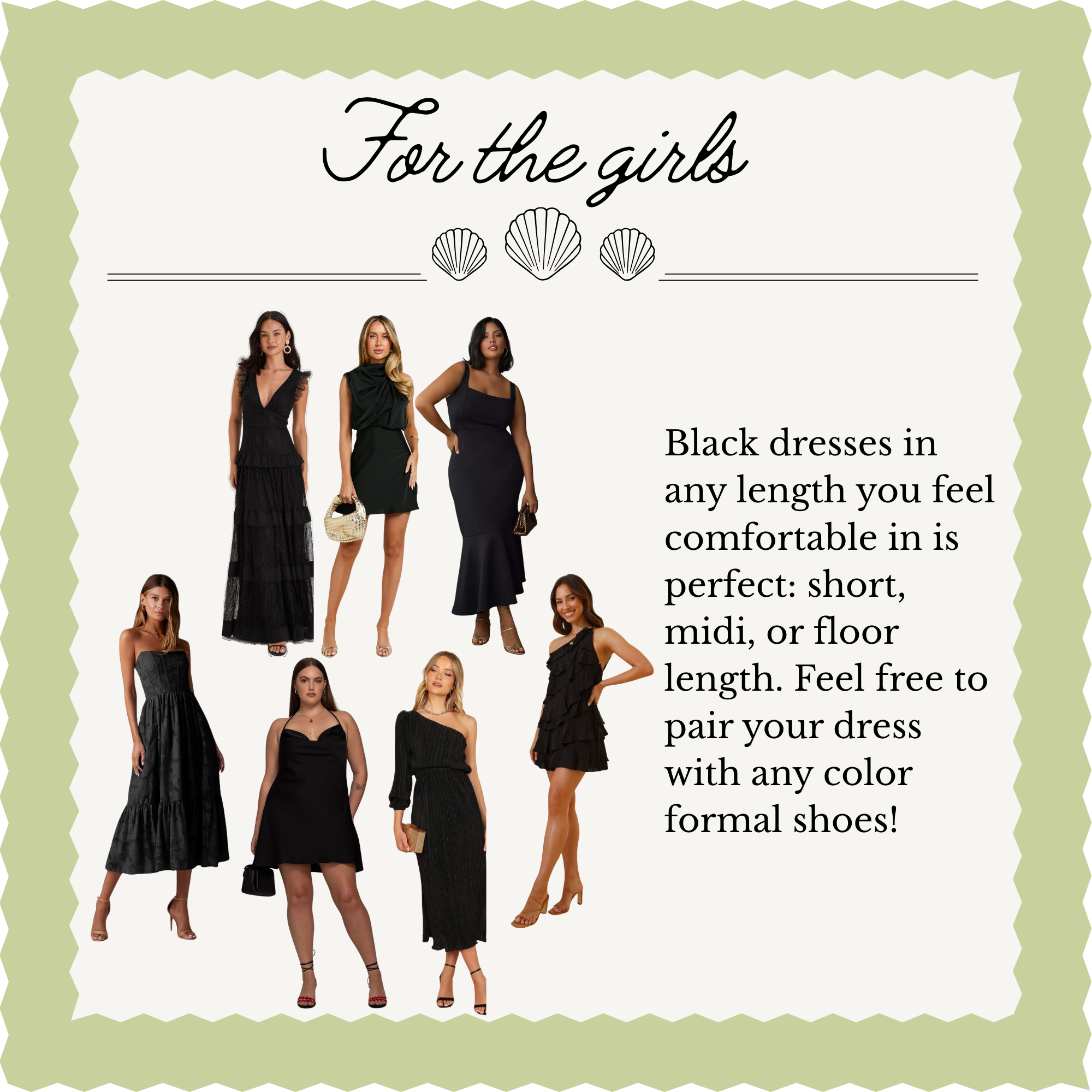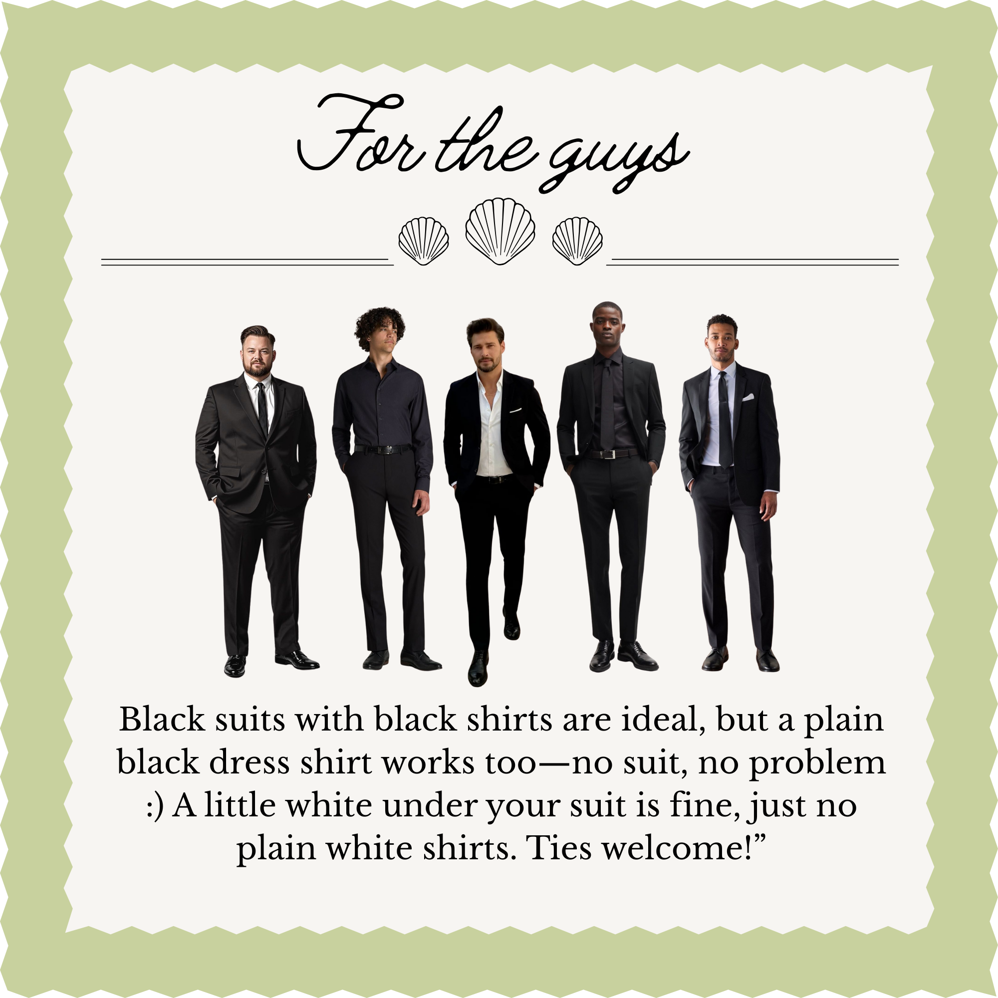 We'd love for our guests to help us set the classy mood with an all-black dress code. Formal, semi-formal, or cocktail attire - wear what makes you feel & DANCE your best, as long as it's all black!