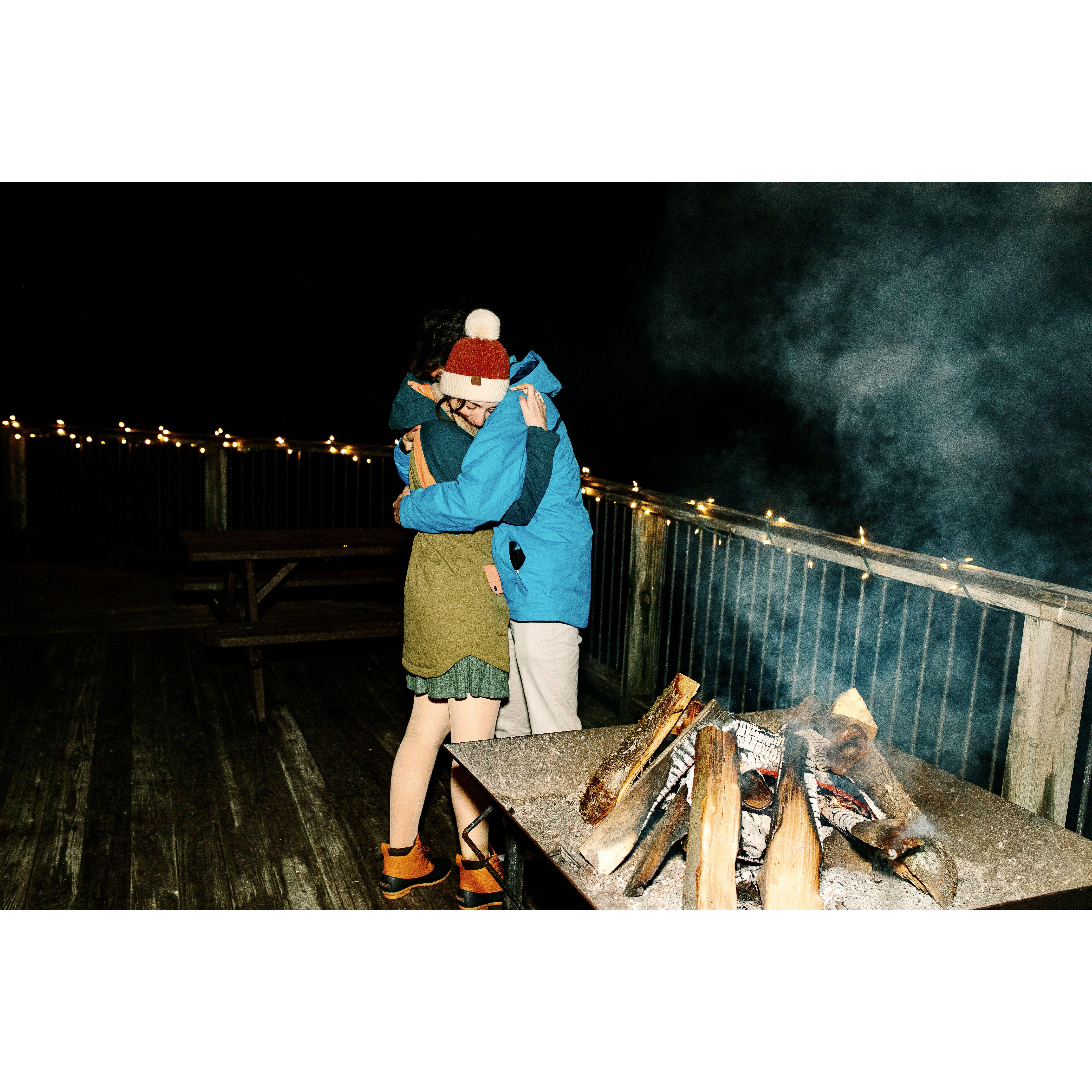 We only took one photo without our coats because it was freezing!