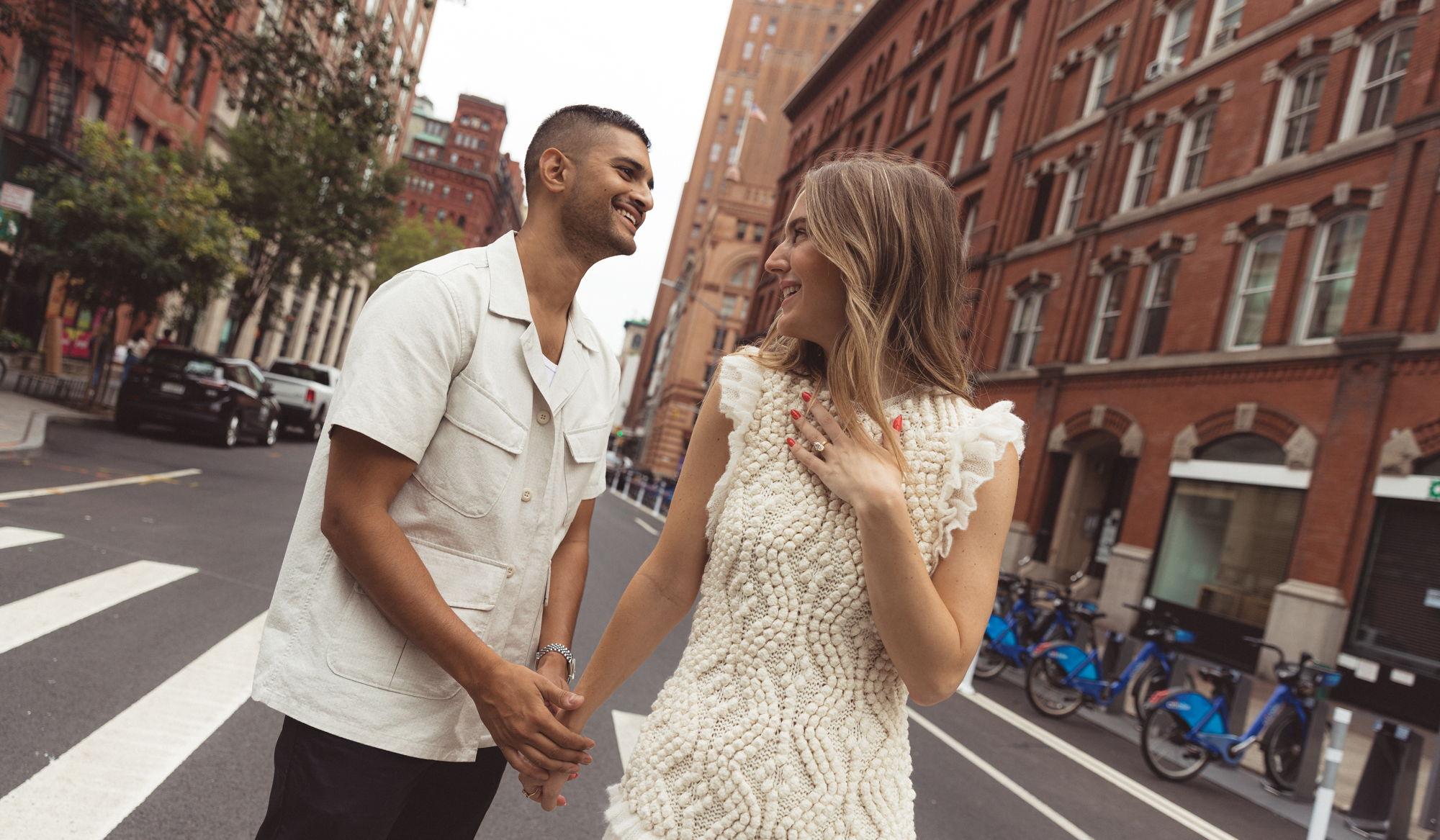 Braham and Shelby first met in Chicago at a mutual friend’s gathering, where Braham took an immediate interest in his wife-to-be. So much so that the first words he spoke to her were a proposal, using a fake ring he found on the ground on his way to the soiree. They decided to explore what could be between them, and went on their second date 10 days before Braham moved to New York. Logic couldn't keep them apart. After proclaiming they wouldn't date due to circumstances, they flew to visit each other every 2 weeks until finally deciding to acknowledge their relationship. They dated for long-distance for 6 months until COVID brought Braham back to Chicago "for two weeks" with little other than a floor length, hooded, monogrammed velour robe and gym shorts. After 6 months of pure elated hunkering down, Shelby made the move cross country to begin building a life in New York together. Being blessed with a strong community, they have spent the last 4 years living life to the fullest, making unforgettable memories, and traveling everywhere they're able to any chance they get.