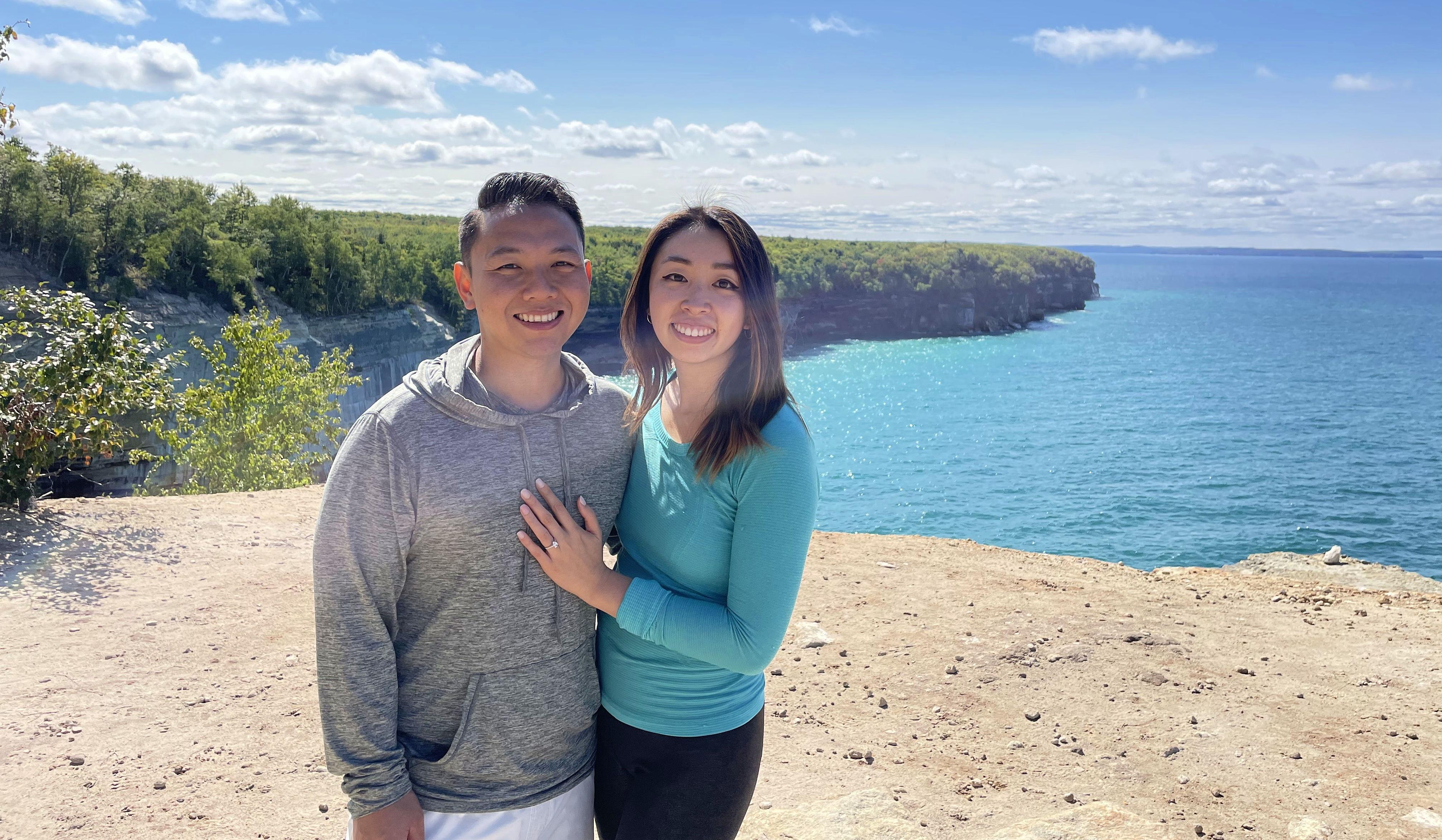 Sarah and Anthony met through Hinge in December of 2019, when she was in Chicago for neurology residency and he was working as an ID pharmacist. After connecting over messages about their shared desires to learn how to play "My Heart Will Go On" as children and favorite Asian foods in Chicago, they met for their first date at Jeni's. The rest is history! Sarah remembers feeling like after they first met, she couldn't wait to see him again, and that feeling just never went away. They continued to bond over cozy movie nights, couch co-op games, and road trip adventures. In September 2022, a road trip to the Upper Peninsula of Michigan would prove to be their most memorable one yet. During a hike along the beautiful Pictured Rocks lakeshore, they reached a picturesque overlook called Grand Portal Point. Sarah set up her phone on a tripod to take a picture, but Anthony secretly switched it to video so that it would be recording when he got down on one knee! After having a small City Hall ceremony in 2023, Sarah and Anthony are so excited to celebrate with their friends and family with the party they both have dreamed of!