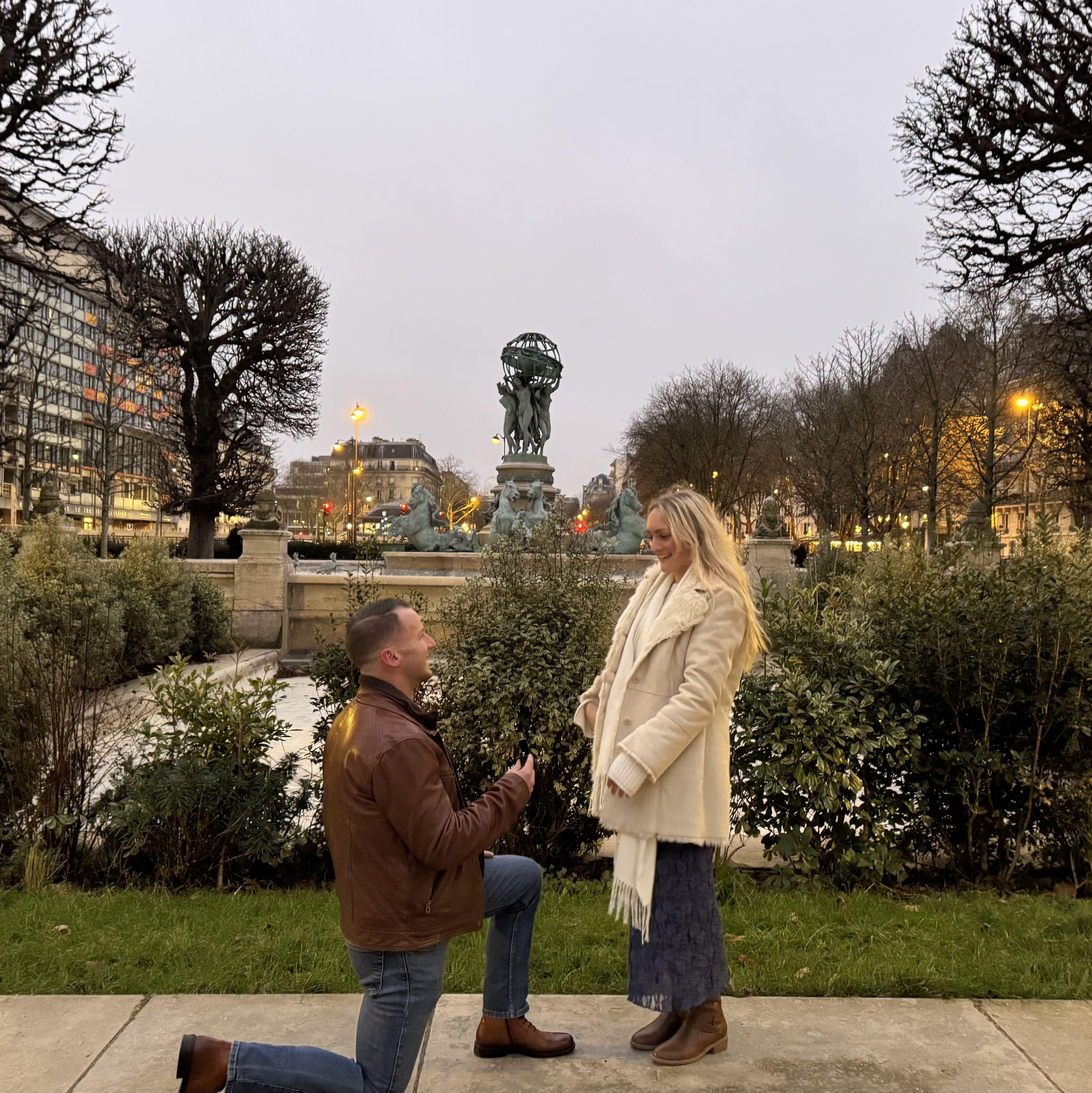 After a wonderful week in the south of France, they had just landed in Paris. As usual, Brandie was ready to hit the ground running and start exploring the city—and, coincidentally, Cameron was just as eager. Earlier a friend had casually texted Brandie, suggesting a visit to the Luxembourg Gardens where there was supposed to be a fun New Year’s Eve celebration (this was a lie). As they were making their way there, Cameron was subtly "texting his dad"—but in reality, he was coordinating with one of Brandie’s friends, whom he had secretly flown out to Paris to capture the proposal. When they arrived at the Jardin Marco Polo, a quiet spot tucked just beside the main gardens, Cameron got down on one knee. After heartfelt words from Cameron (which neither of them can now fully remember), it took Brandie only a few seconds to say “yes” to forever with him.