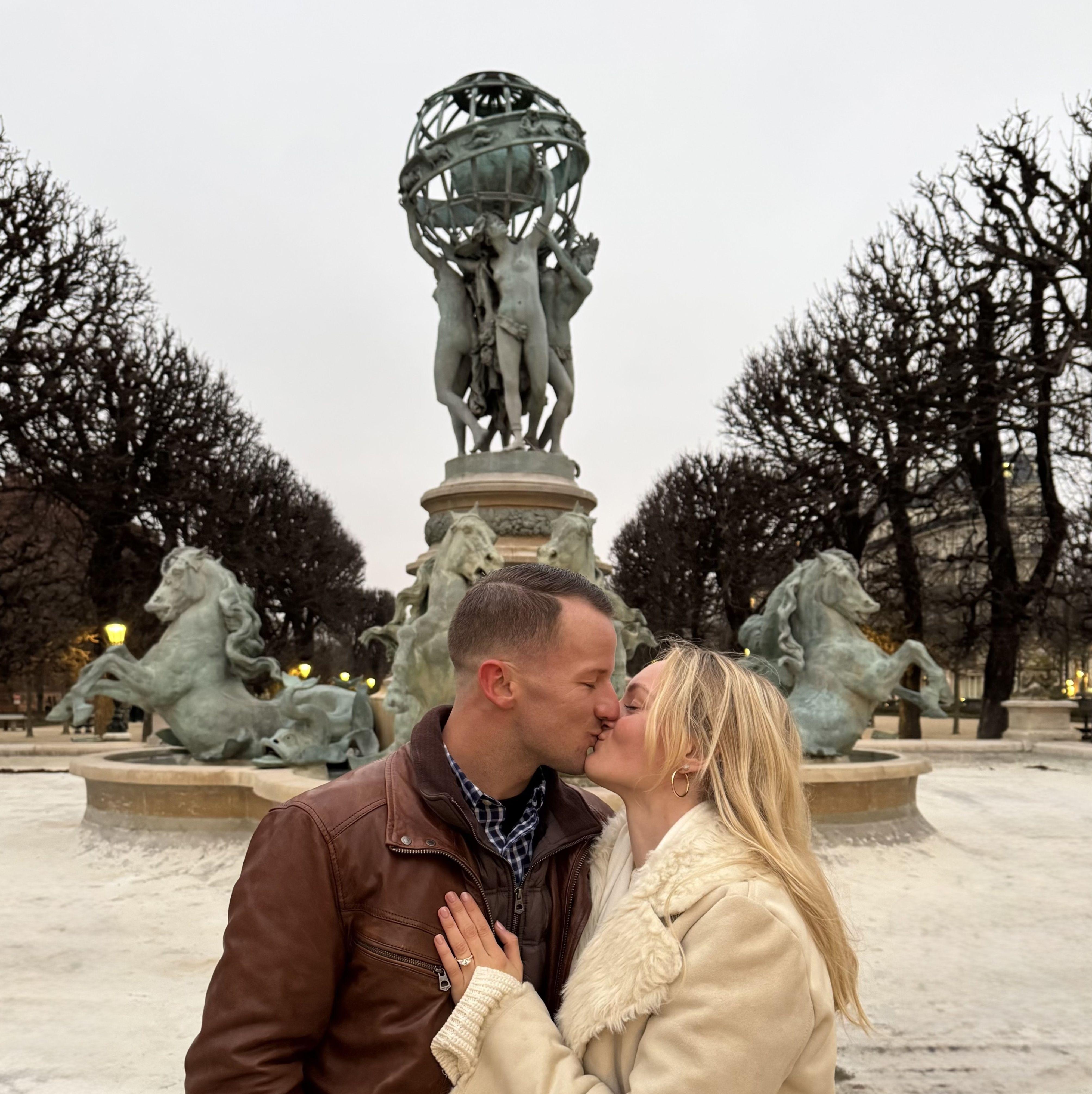 Despite a series of hiccups—including Brandie getting food poisoning from escargot the night before, the main section of the Luxembourg Gardens being closed when they arrived, Cameron losing cell service while coordinating with their secret proposal photographer, and the near-freezing temperatures—the moment couldn’t have been more perfect. Cameron proposed in the Jardin Marco Polo, in front of the Fontaine des Quatre-Parties-du-Monde (Fountain of the Four Parts of the World). The sculpture features four women representing the cardinal points (Europe, Asia, Africa and America), holding a celestial sphere above their heads—a fitting backdrop for the moment. Given Brandie’s love for travel and the fact that this was the couple's first international trip together, it felt like it was always meant to be.
