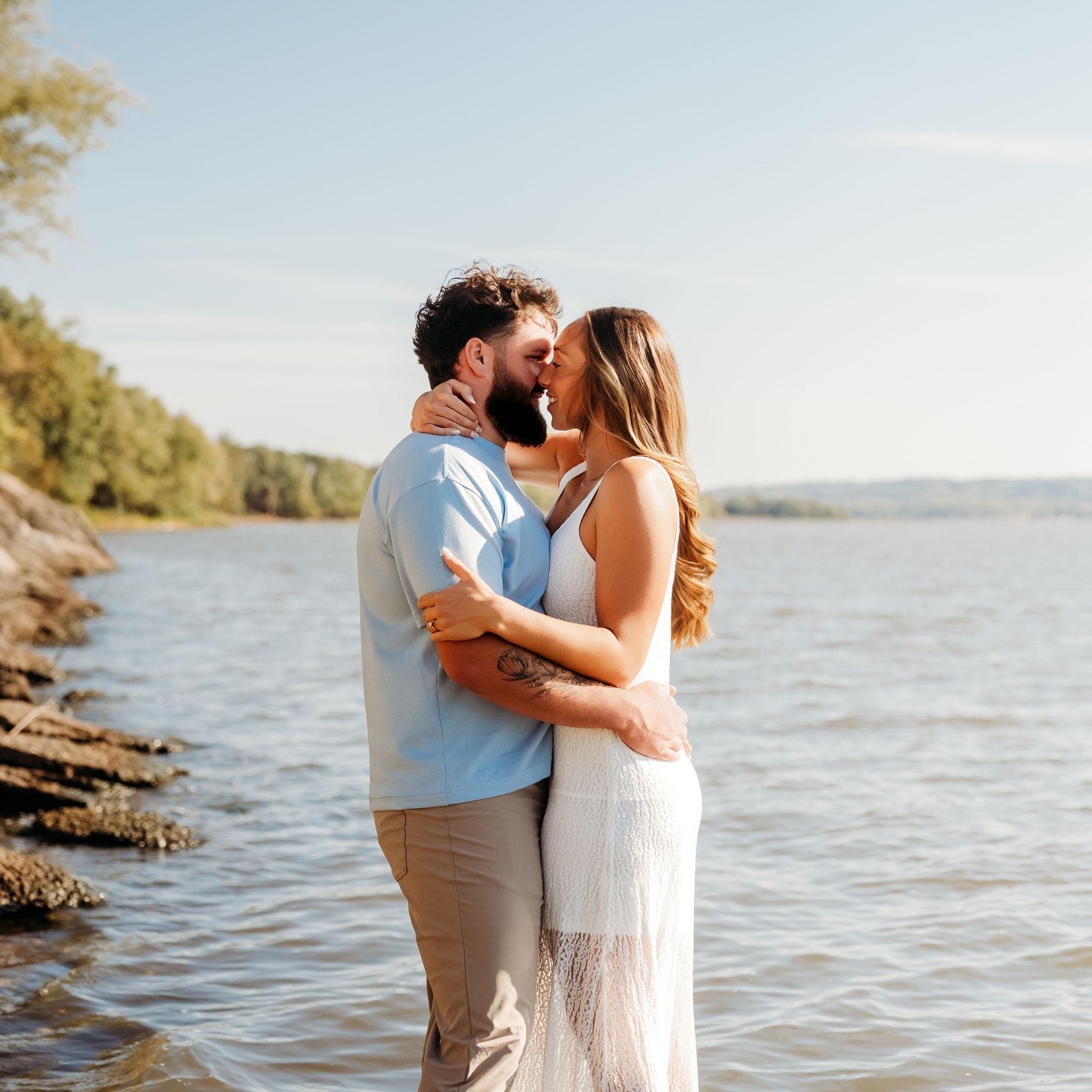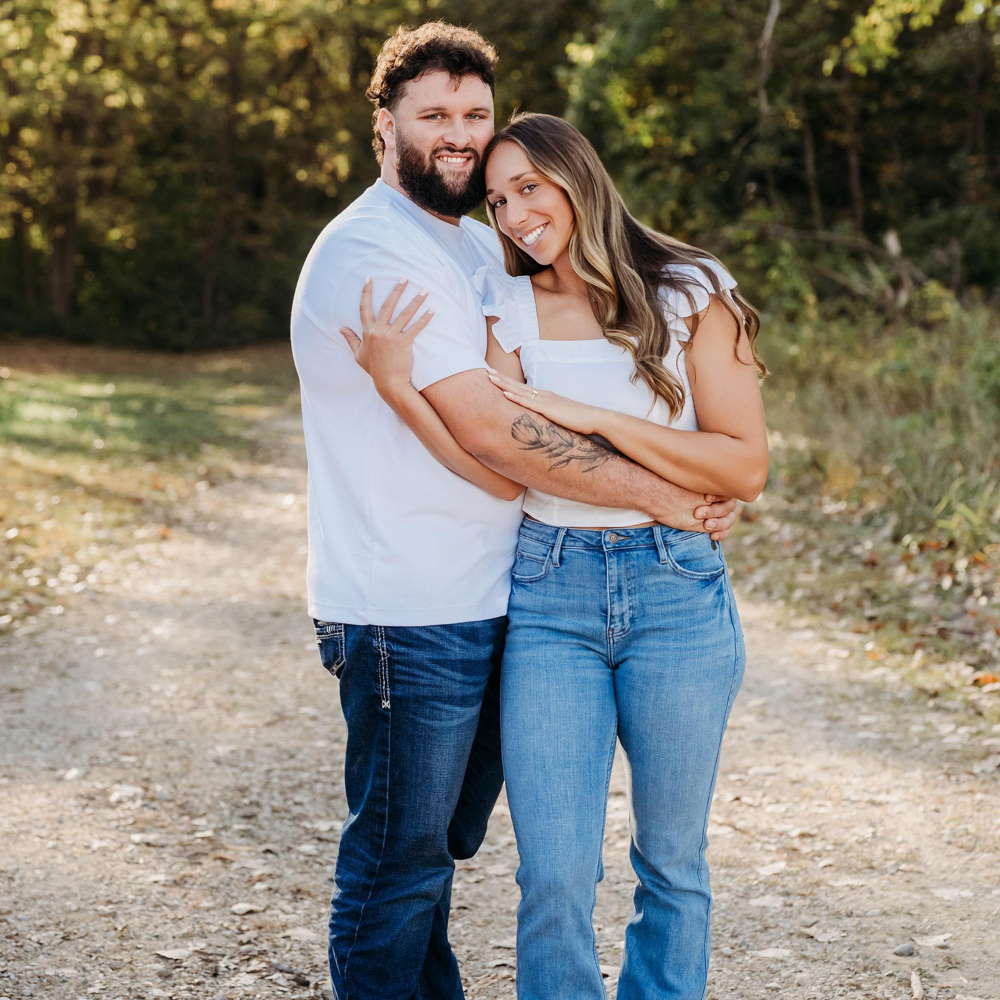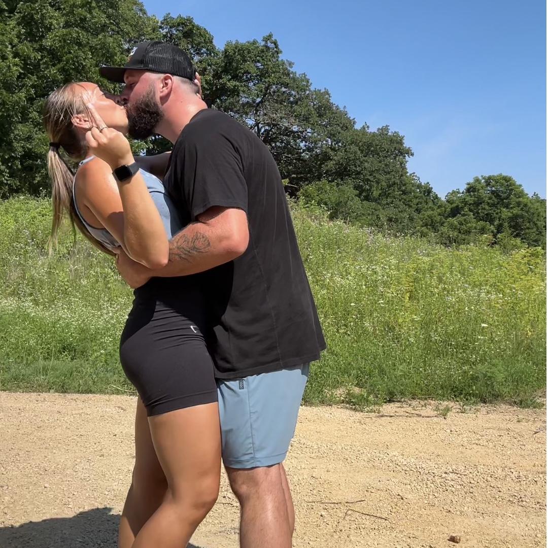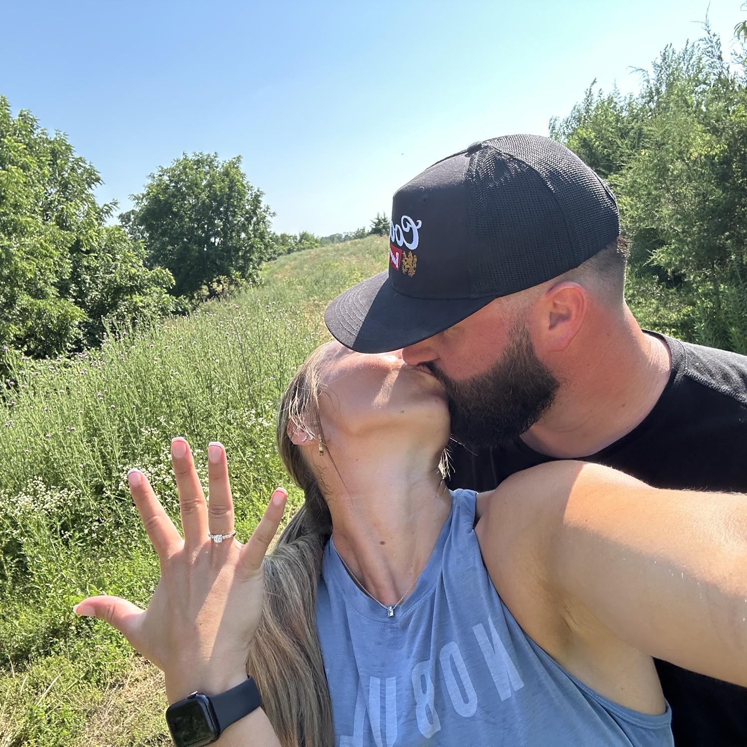 Nick proposed on July 5th, 2025 at his family farm. Nick took us on a morning hike to start the holiday weekend. After a mile of Nick being goofy and us ready for the lake water, he dropped to a knee!