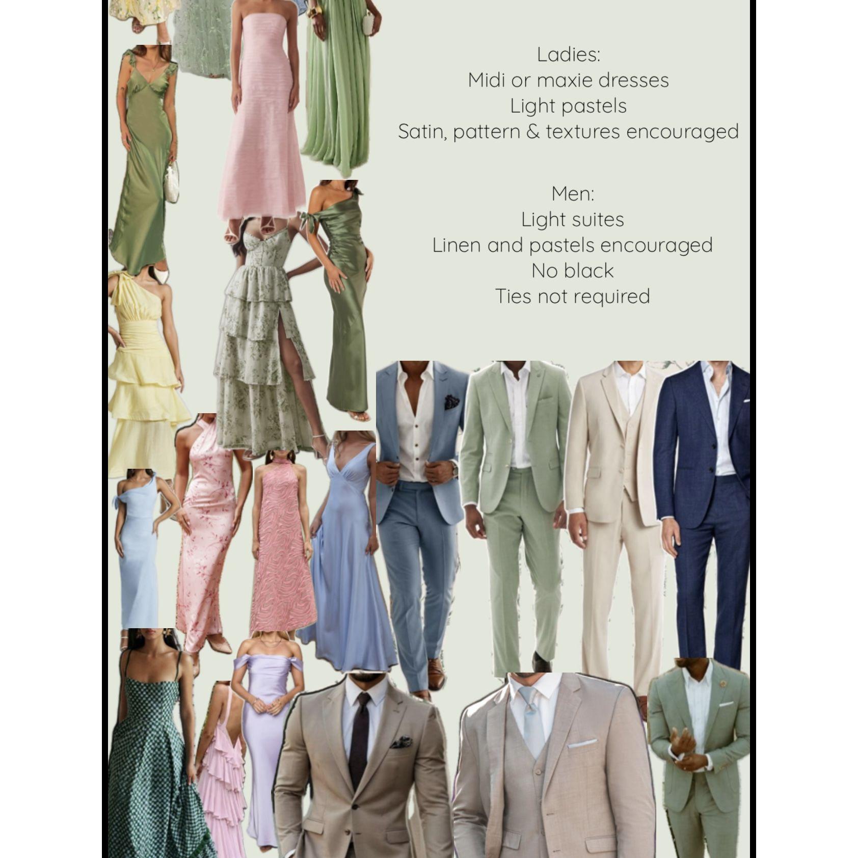 The Dress Code for our Wedding is "Southern" Cocktail Attire. I have included photos for both the Ladies & Gentleman for inspiration Please no outfits that are solid white, beige or cream colors for ladies.