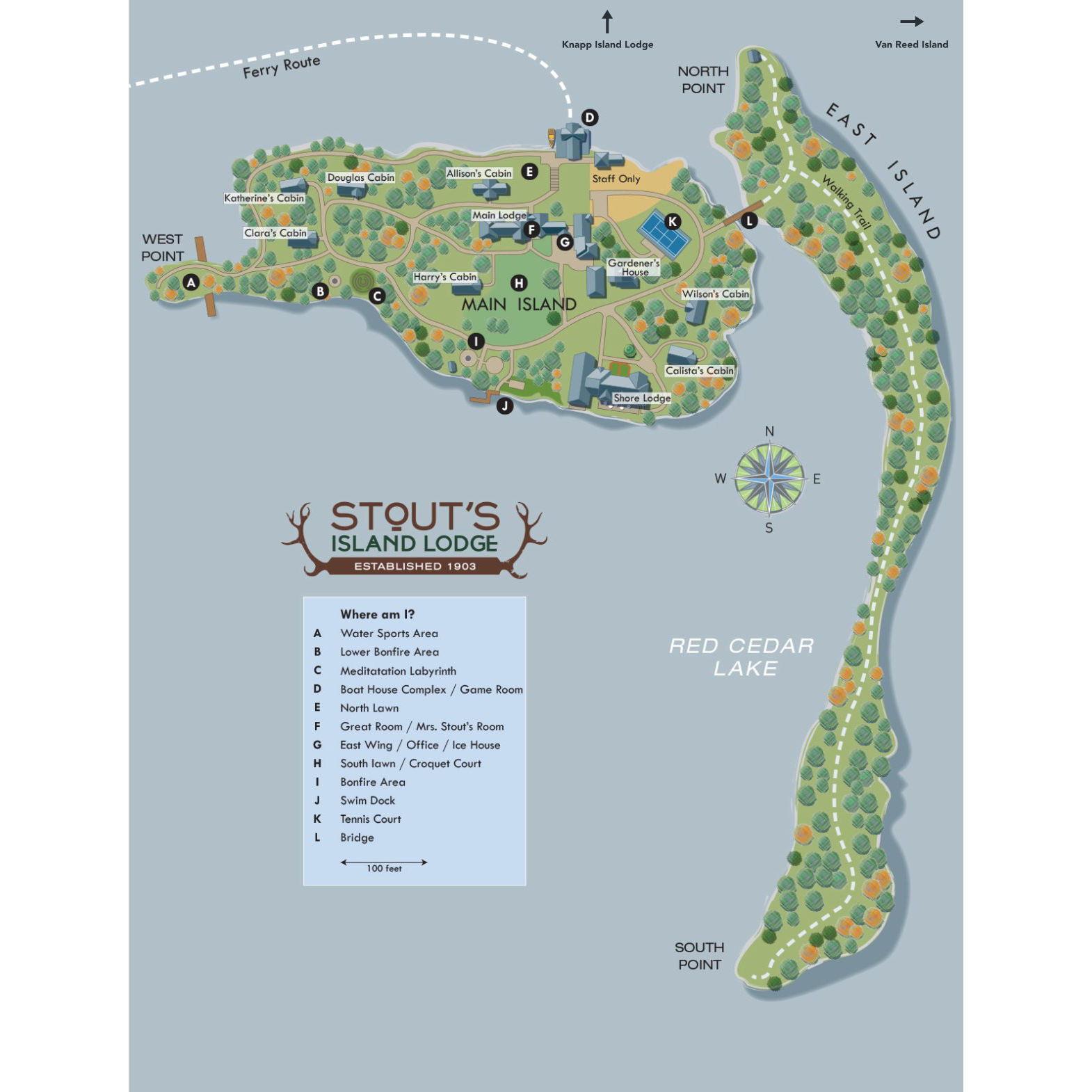 The address for the lot you will leave your vehicle in is, 2799 27th Street, Birchwood, WI 54817. This address will bring you to the parking lot which adjoins a gravel path that will lead you to our Shore House waiting area and dock. The ferry will pick you up at this dock. We suggest entering "Stout’s Island Lodge" into your GPS device as a location instead of the address. Thank you!