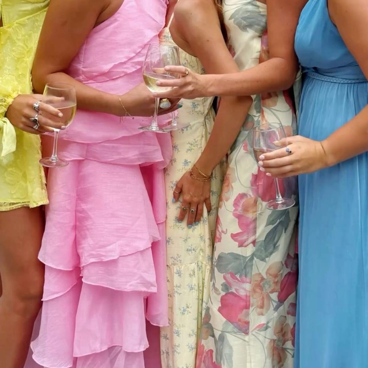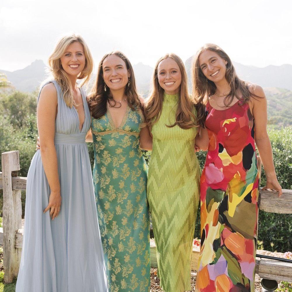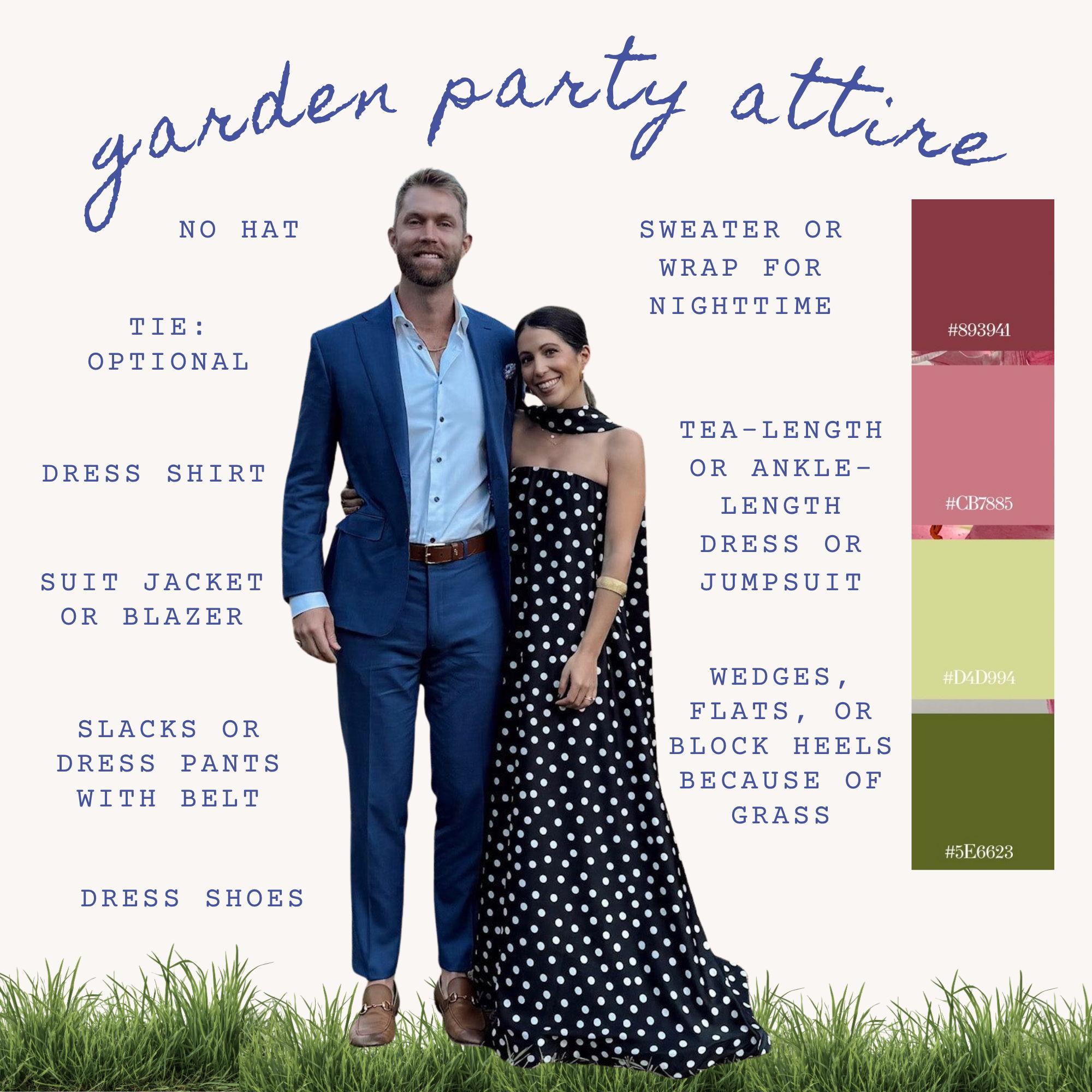 For the ladies: Tea-length or ankle-length dresses or jumpsuits are perfect. Heels, wedges, or flats are all great—pick what’s comfy, since the entire celebration is on the grass. Please, no white—we’re saving that for the bride.