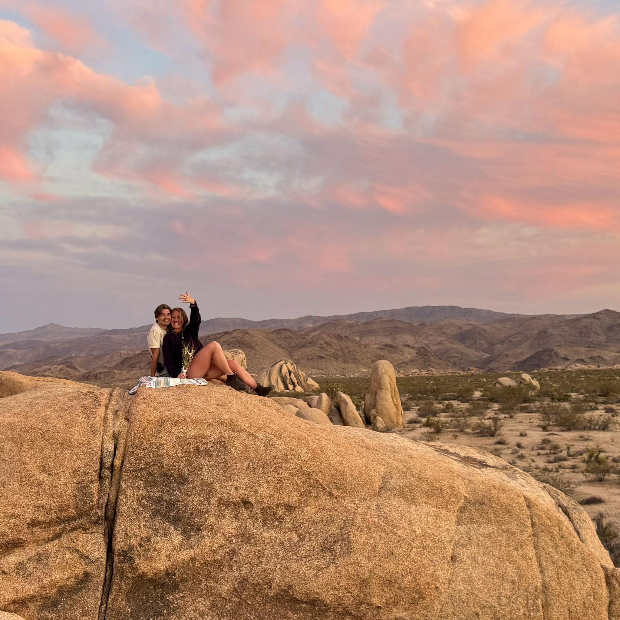 I truly don’t really remember. What I do remember is thinking how annoying it was when Caleb suggested that we leave our Joshua Tree campsite – where we’d just settled in with a deck of cards and a cold beer – to drive 30 minutes to a “cool rock area” and watch the sunset. No way. However, my boyfriend, brother, and sister-in-law all thought it was a great idea so reluctantly I returned to the car and complained the whole ride. It wasn’t until Caleb rushed me to the top of a big rock, tears filling his eyes as he recounted early moments of our relationship, that I wondered where Matt and Kate had gone. I asked Caleb “what exactly is happening here?” From there it was all a blur – beautiful words, him down on one knee, a new weight on my hand and cheering from the strangers a few rocks down – all under the bright pink desert sky. The next morning, Caleb repeatedly caught me staring intently at my hand with the new ring on it, as I confirmed with him that I had for sure said yes (I did). A few hours and (another) dead battery later, we were driving out of the park as fiancés, tearfully calling our friends and family to tell them about the start of our newest chapter.