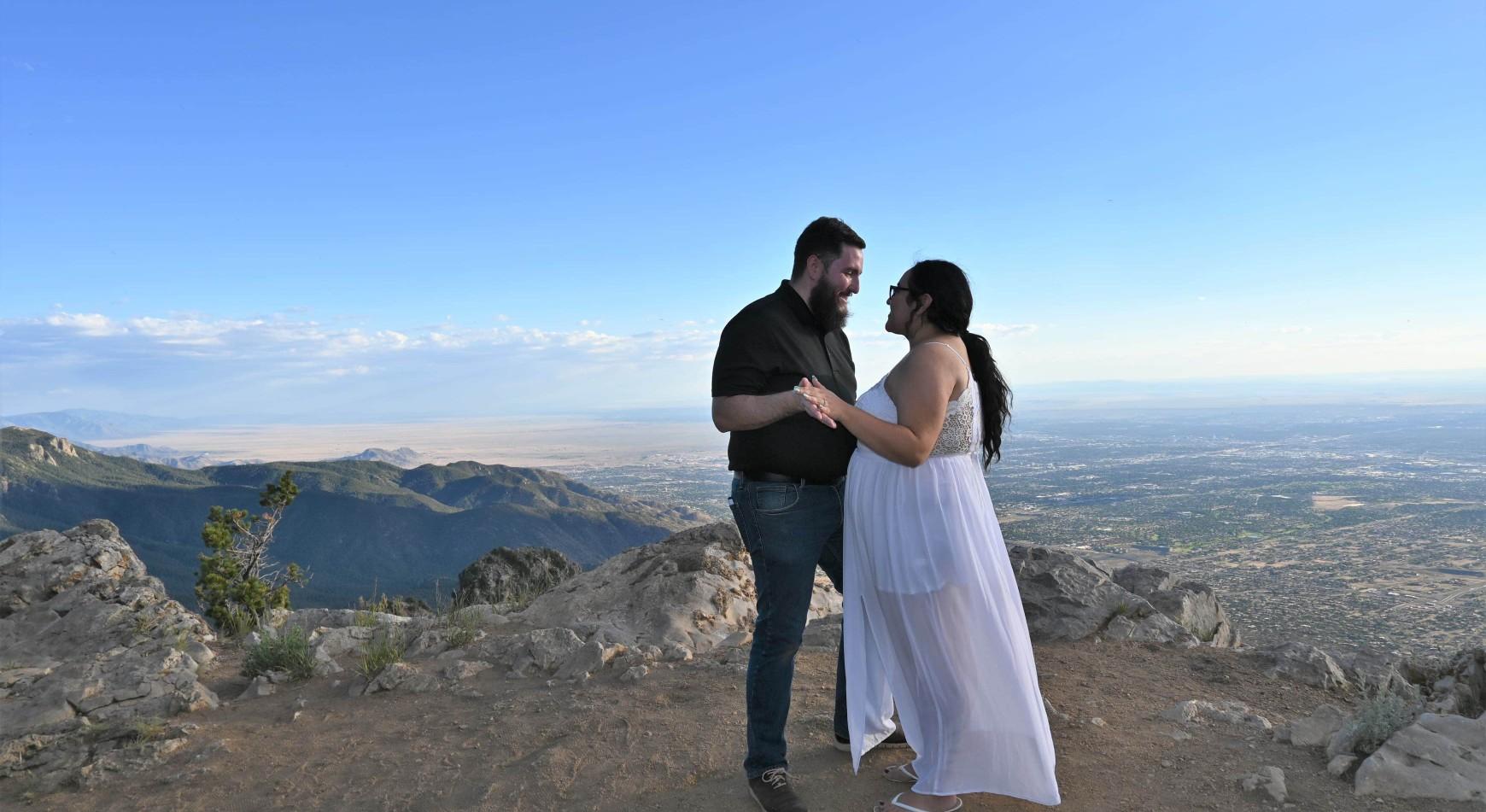 It was the 4th of July 2020 and we were relaxing outside. Mo turned to me and asked, "Can I take you on a date on Wednesday?" and I said yes. I was slightly suspicious because about a week before I had seen (and purposefully ignored) a receipt from the jeweler in his car. I told my mom and sisters what I thought was happening and they were so excited. Ermelinda went to Belen the next day and while she was there, she bought me a beautiful white dress. The dress didn't quite fit so my mom stayed up really late to fix it. We planned my hair and makeup. I was so nervous but also so excited. I was trying so hard not to let on that I knew. Finally, Wednesday came and I began to think that maybe I had jumped to conclusions. My mom was helping me get ready and I told her, "I don't think this is what I thought it was." She told me, "I don't think so either, but just go and have a good time and enjoy a nice date." And that's what I did. We drove to Albuquerque and stopped at a lovely tea shop. We looked around, bought some tea, and bought tea to drink. We both had forgotten our masks in Mountainair, so we ran next door to Target to buy some. Equipped with our new masks, we headed to dinner. Mauricio had me close my eyes so it would be a surprise, but I knew where we were at and I asked him if we were going to the tram. He said yes, that we were going to eat at the restaurant up top, and let me open our eyes. We got to the tram and parked and started heading to the boarding area. At this point, I was still thinking this was a normal date. We started walking up the stairs to the boarding area and I hear a voice that sounded like Mo's mom, Nancy, but figured that it must be someone else with a similar voice.