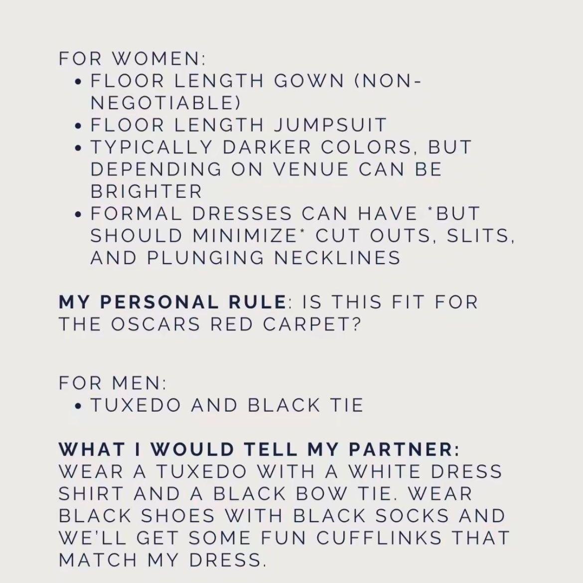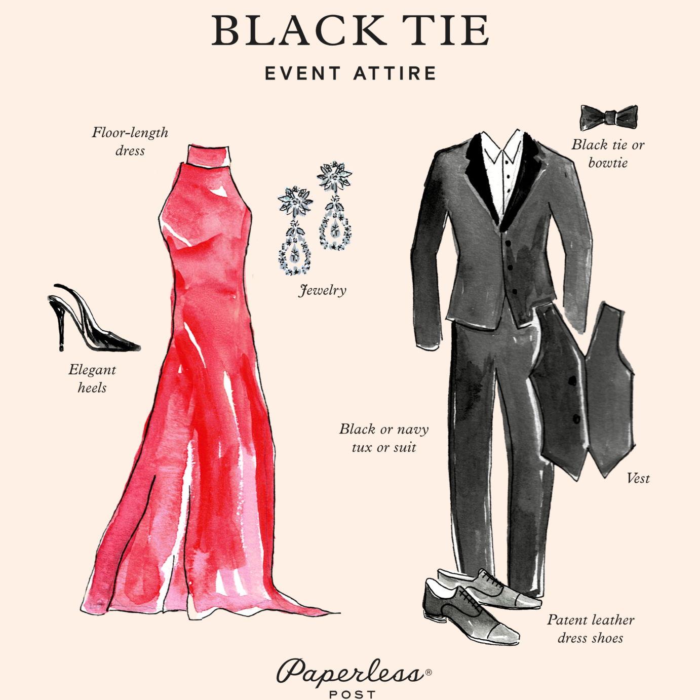We're so excited to celebrate with you! The dress code for our wedding is black tie, which is a fun chance to dress up! For the ladies, think floor-length gowns or chic cocktail dresses. For the gentlemen, tuxedos or dark suits with a tie would be perfect. We've included some inspiration pics below to give you some ideas. If you're unsure about anything or have any questions at all, please don't hesitate to reach out, we're here to help!