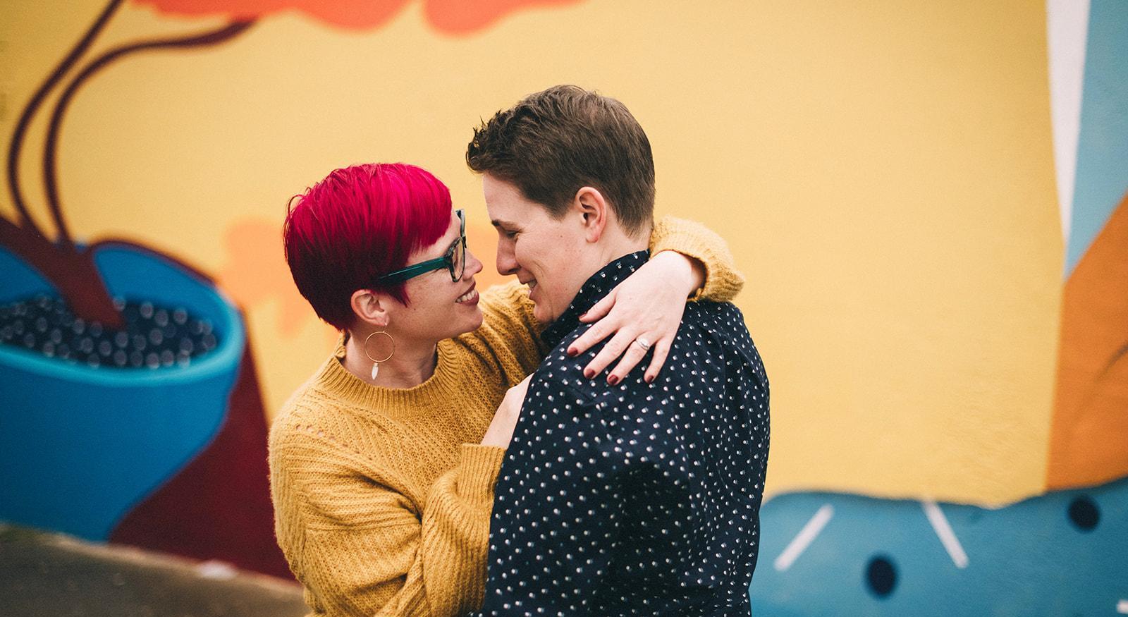 Charbecca met in January of 2018 on a dating app that Rebecca drunkenly downloaded one lonely Saturday night. Char lured potential dates with their dashing smile and adorable pitt bull, Petie. We met for a lunch date (that neither of us wanted to end!) at Wiltshire Cafe at the Speed Museum. On our one-year anniversary, Char said Rebecca's only mistake that day was "not ordering dessert" because she ended up eating half of Char's... Turns out this would be a common occurrence in their relationship, much to Char's chagrin.