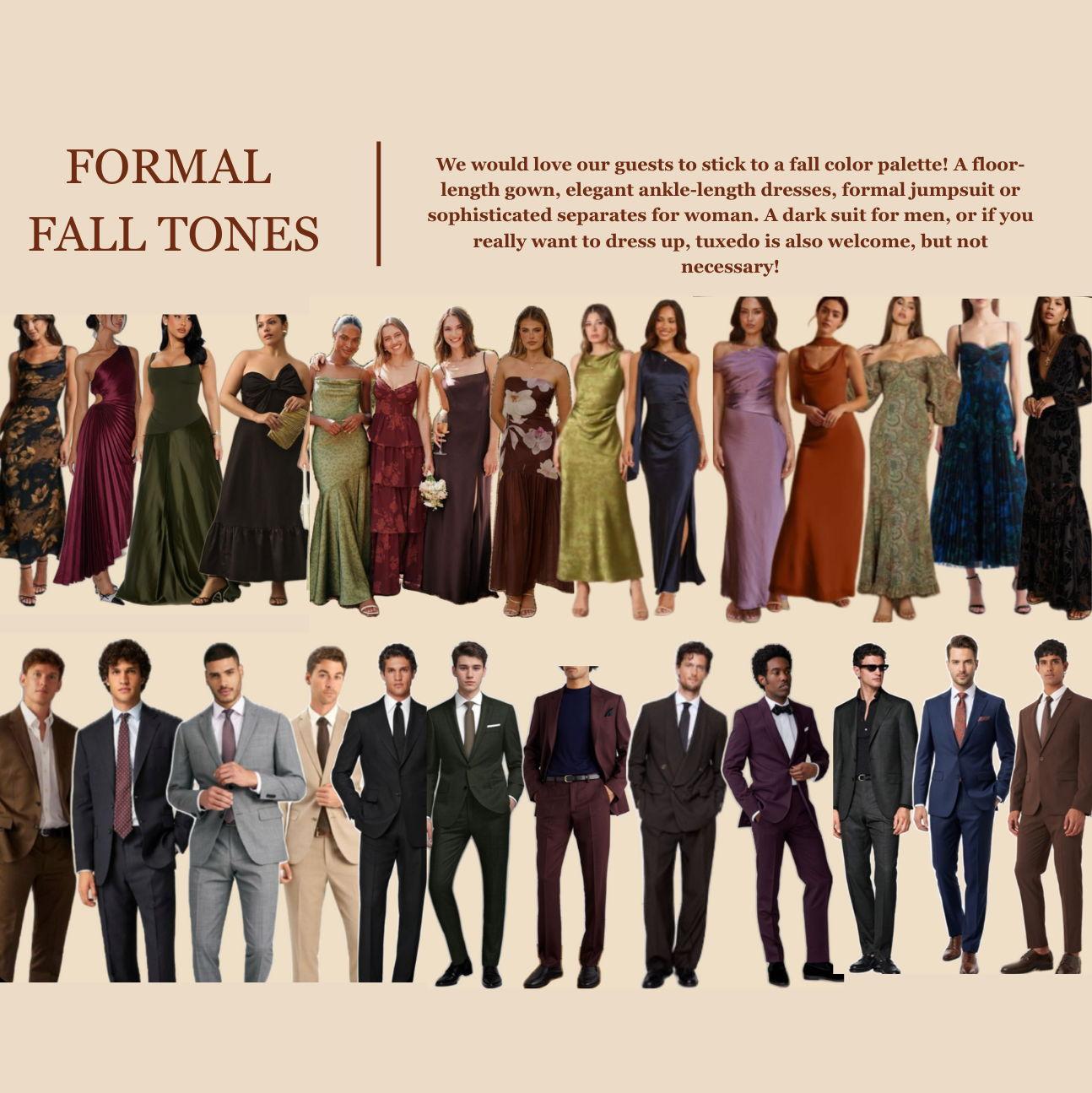 Here is some outfit inspiration! Remember: The ceremony will be outside in late November, so weather could be a little chilly!