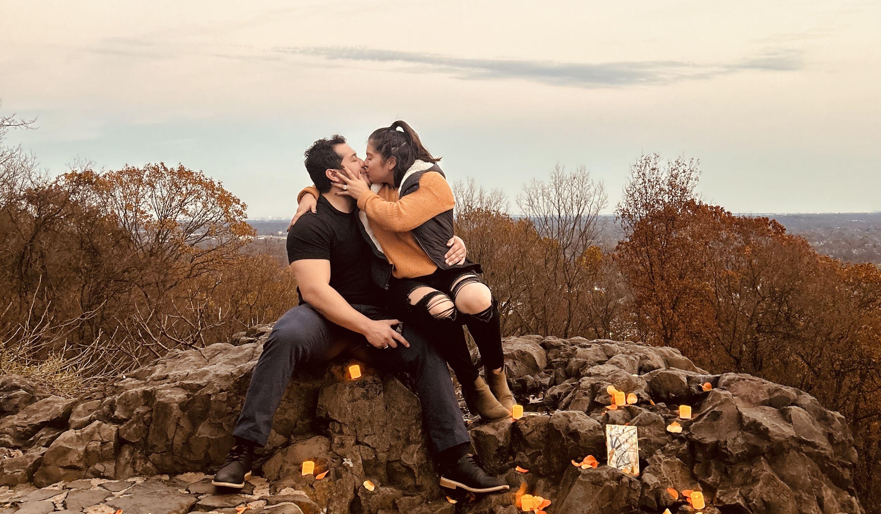 Alex told Cindy that his uncle was in town and wanted to take him to Washington Rock and later to Tia Enith house for dinner. Earlier that day, Alex and Cindy were going to a bodybuilding show to support a few friends, Cindy started to notice Alex was nervous the whole time they were there (shaking his legs) and always on his phone (which is not like him). Alex told Cindy it's her turn to drive home since he drove there and to drive home but Cindy wanted to get straight to Washington Rock but Alex made sure to stall a little longer. Their point of view: When we got to Washington Rock, Alex was trying to look for his family as part of the plan. but we found his brother Juan Pablo and sister in law Kristell and walked toward them. Alex started to talk about our life as we walked down the stairs and when I looked at the end of the rocks I noticed candles and a picture of us. When I turned around he was on his knee. I looked at the beautiful ring and as it was being put on my finger I said “Finally”