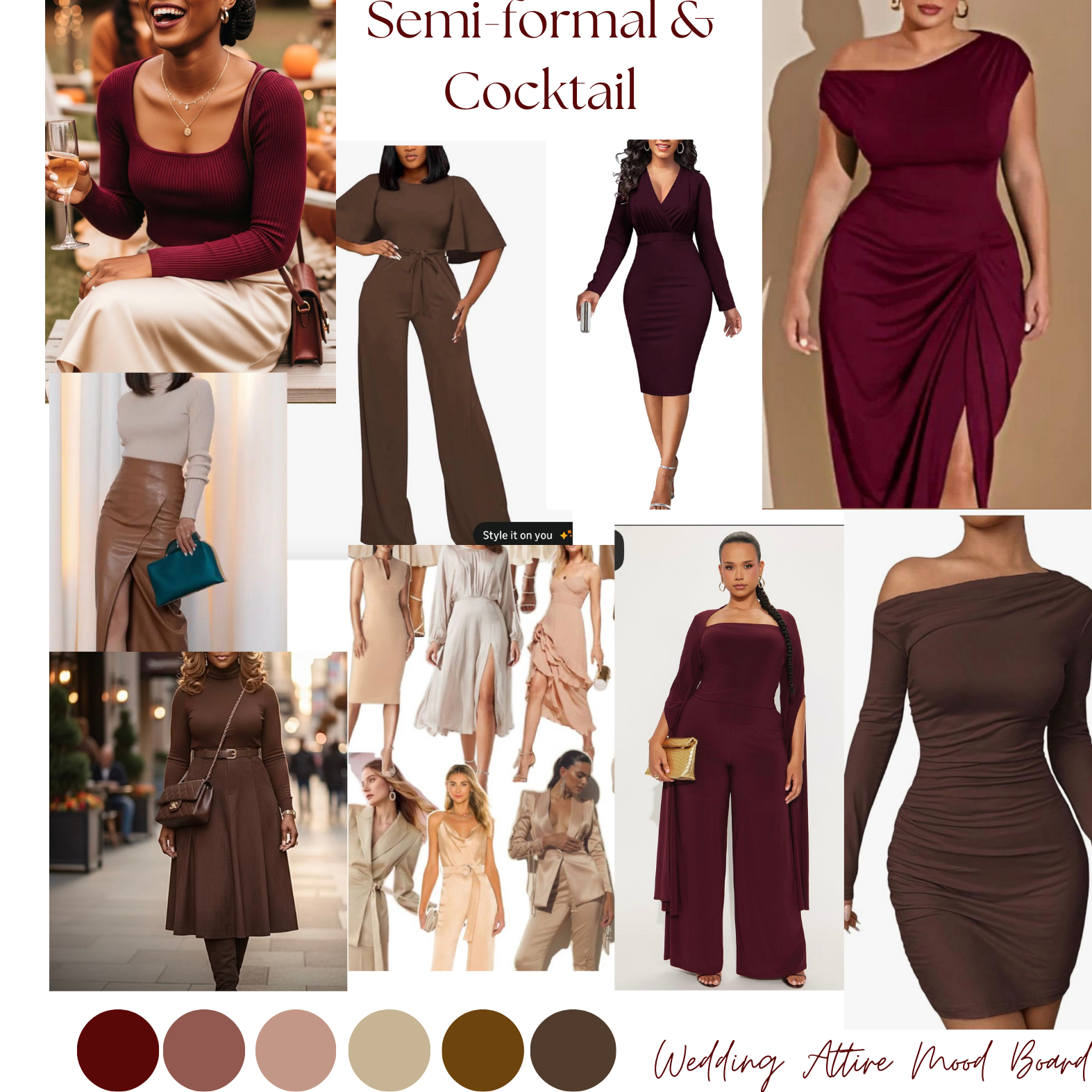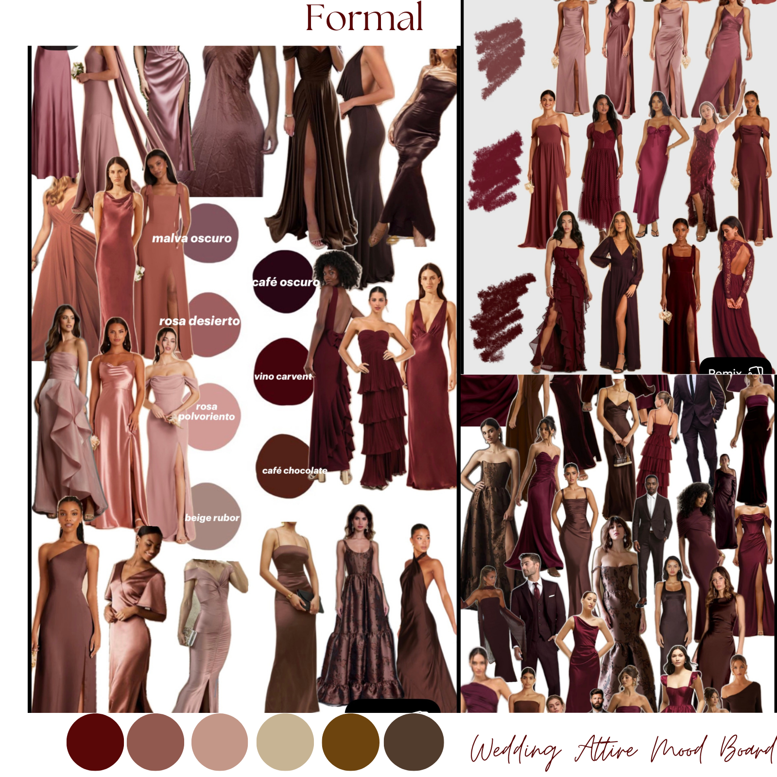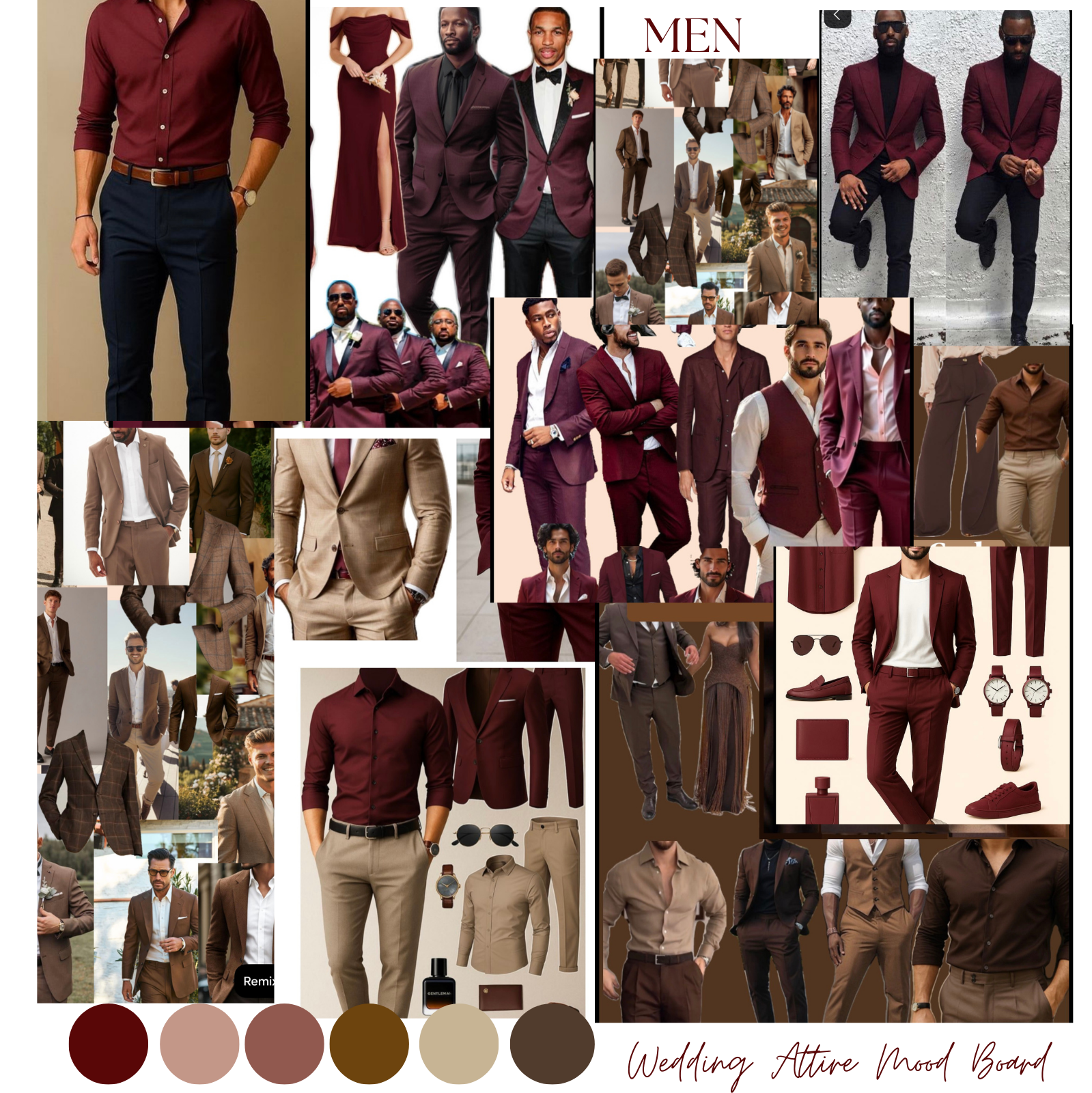 Color Options: Any colors within the palettes of burgundy, maroon, mauve, brown, copper, gold, champagne, tan, and beige. There are reference photos below for both men and women.