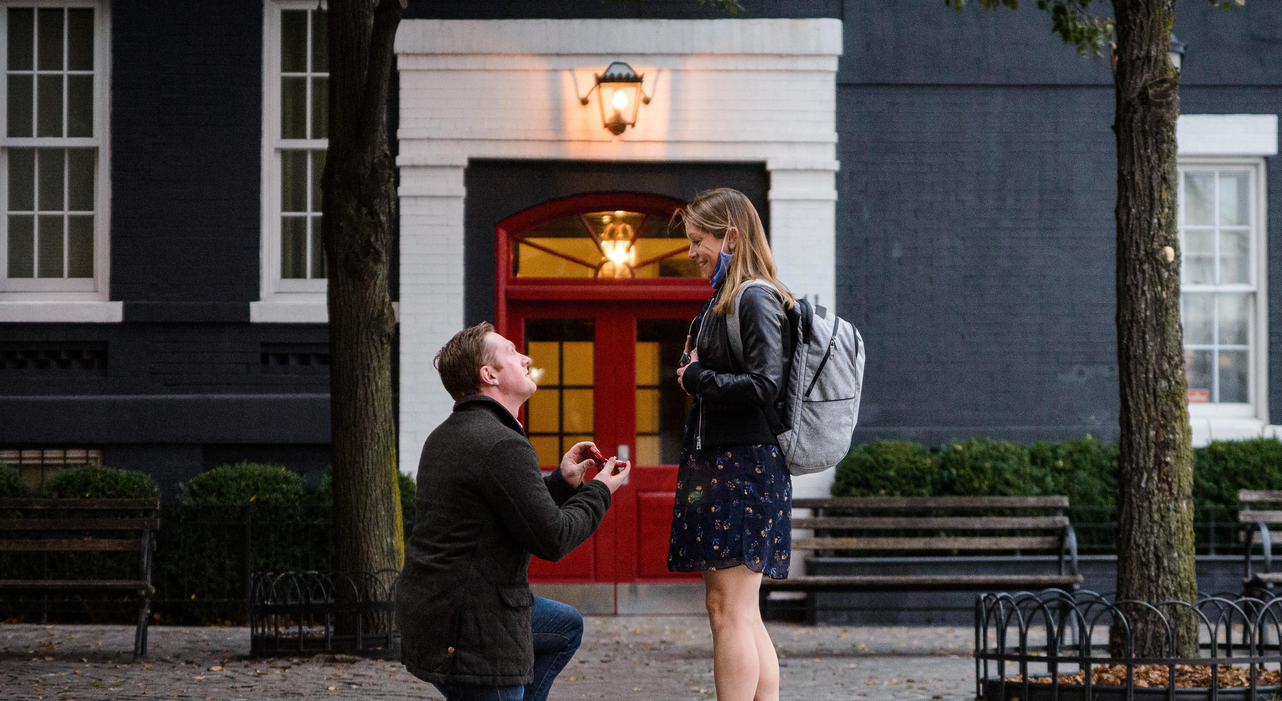 When it came time to take the next step, Connor, against all odds (and with the help of a dishwasher, driveway, and proximity to Wegmans), convinced Maureen to leave her beloved Upper East Side and move in with him in Greenpoint, Brooklyn. Our love grew and Connor's closet space shrank, and all the while, Connor had been planning something special for months. On Maureen's birthday Connor called her to the end of a block overlooking the East River to surprise her with a big question and a little box. Connor took a knee, Maureen immediately realized it was not the puppy she had feared, and said, HOLY SH*T YES! The unforgettable moment became an unforgettable night, celebrating with family from near and far in the best backyard in Brooklyn. We are so excited to keep writing our story and can't wait to celebrate with you all in October!