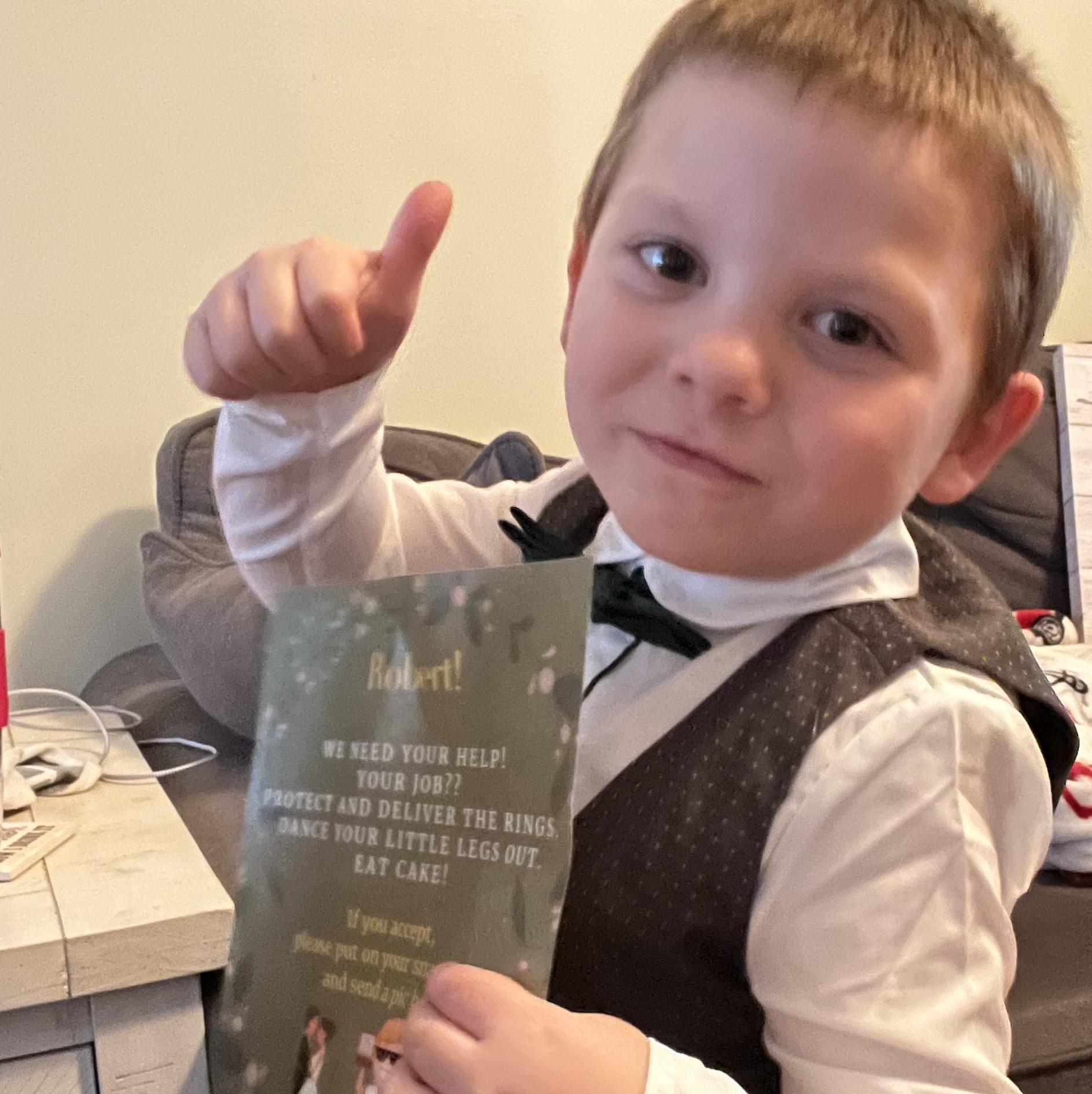 Est. 2017. Robert is 5 years old and he is ready to rumble! He is also James and Karen's nephew! He will be tasked with the mission of protecting the sacred rings down the aisle. He likes legos, Paw Patrol and firetrucks.