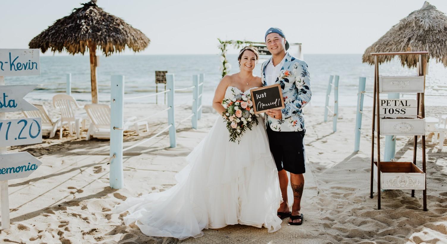 It all started with a swipe right. Sarah and Kevin met online and then met for their first date at The Rock where Sarah beat Kevin for the first time in a game of bags. After many dates, lots of time together and blending their dogs Sarah and Kevin quickly became a family of 7 (1 teenager, 2 dogs, and 2 cats). Kevin and Sarah have been so lucky to share many experiences with their families and friends over the past two years including backyard bbqs, Brewer's games, and travels. On their last big trip to Hawaii Kevin finally popped the question with a beautiful engagement ring at a sunrise in Maui. After a short postponement Sarah and Kevin finally tied the knot in sunny Puerto Vallarta in November. They look forward to celebrating their marriage with you this summer.
