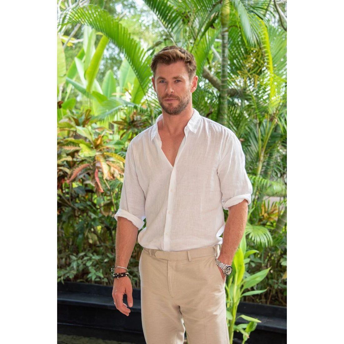 Camisa de lino manga larga color blanco y Pantalón de lino color beige. De las siguientes fotos, tomar como referencia ÚNICAMENTE la vestimenta. La cara y el cuerpo son opcionales.