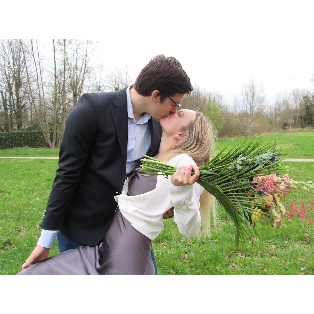 We took kept trying to take some sunny photos in Belgium when we first got engaged. In early March, this was the best we got!