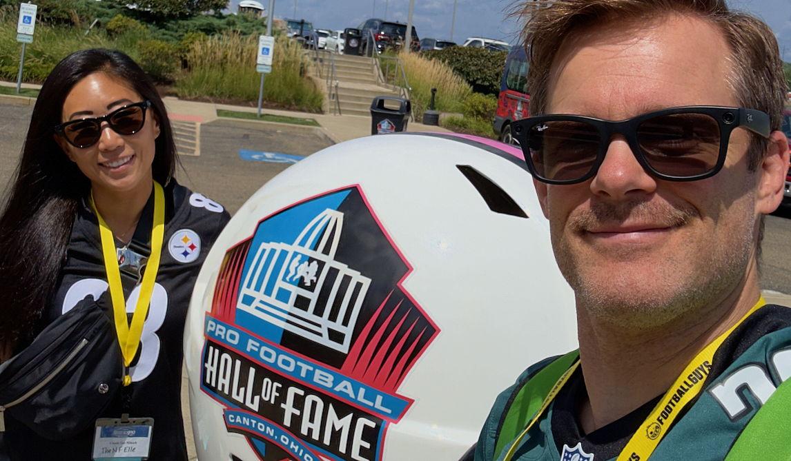 We met January 20, 2018- the first day of the 2018 Stunt Softball League season. Cassie immediately took notice of Bryan's softball ability, Bryan was impressed with Cassie's management skills. We soon realized we had so much in common, and nearly all of the same interests. We love spending time with each other traveling, watching sports both live and on tv, creating projects, doing escape rooms, eating good food, and taking care of our animals. Quarantining together and hanging out with one another 24/7 during the pandemic was honestly a lot of fun, and when we realized that we were each other's person. In 2025 we took a trip to Canton as attendees of the Fantasy Football Expo. Cassie had somehow developed somewhat of an online presence in the Fantasy Football world, which was of course Bryan's fault for even introducing her to fantasy football. Canton is a historical, iconic place in the world of football. We are thrilled to have you celebrate our two teams merging (like a more permanent version of the 1943 Steagles...) in a place that is pretty special to us.