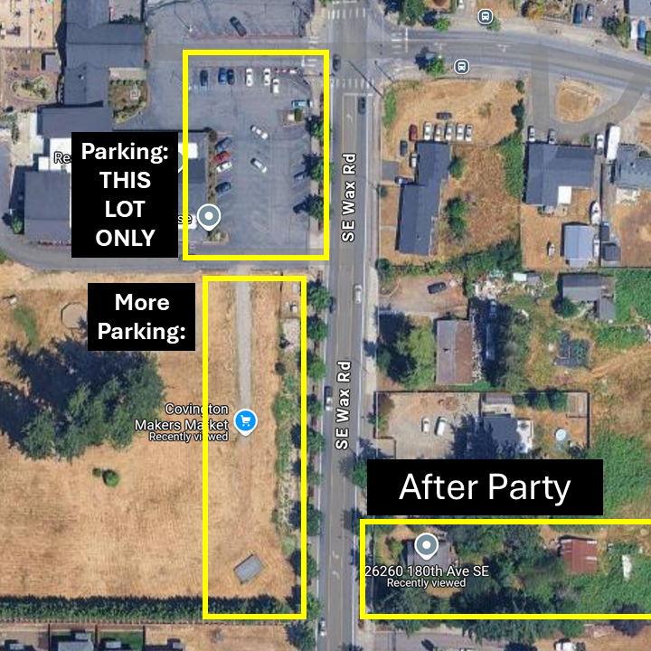 Limited parking will be available at the after-party location, but there is a church across the street which has provided a portion of their parking lot with limited availability for parking as well. See the image above for a visual. After party Address: 26260 180th Ave. SE Covington, WA 98042