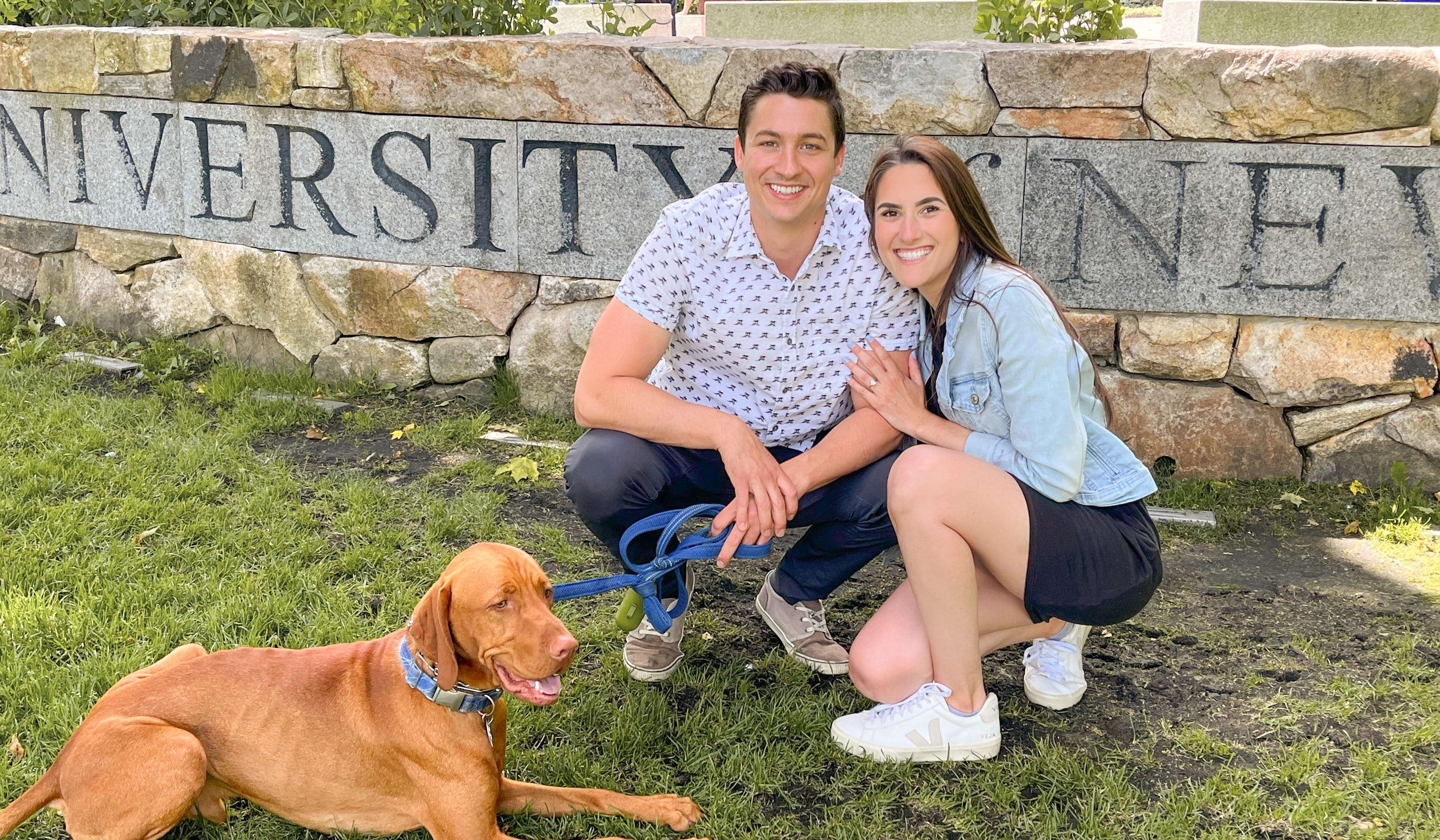 Elyssa and Tyler met in 2014 at The University of New Hampshire. Elyssa walked into one of their mutual friend's apartments one night and immediately was drawn to Tyler's gregarious personality and contagious laugh. After 6 months of being good friends and getting to know one another better, they realized there might be more than a friendship in store. Tyler asked Elyssa on a first date and together they explored Wagon Hill Farm, a local outdoorsy spot in Durham, NH, while getting to know one another better. It was that same day that Elyssa realized Tyler made her smile like no one else ever had. They continued spending time together that spring, making things official in March of 2015. At the end of the school year, they went home to their respective towns but continued to spend the weekends together meeting each other's families and friends, going to Red Sox games, and spending time relaxing at Tyler's brother's house on Lake Maspenock in Hopkinton, MA. When the Fall came around, Tyler and Elyssa couldn't wait to get back to school, where they'd be able to see each other all the time. Fast forward to May 2016, Tyler graduated and found out that the saying "distance makes the heart grow fonder" really was true. Despite the distance between them, Elyssa and Tyler continued spending weekends together up at UNH as well as back home in Hopkinton. Elyssa joined Tyler in the "real world" in 2017 and upon finishing graduate school in 2020, Elyssa moved in with Tyler and his brothers in Hopkinton. In August of 2020, the two realized that they couldn't live with Tyler's family forever (despite Tyler's wishes), and bought their very own house on Lake Maspenock. In 2021 Elyssa convinced Tyler that they NEEDED a dog, so mid-pandemic they flew to Virginia to pick up an 8-week-old Vizsla puppy, Whiskey, who made their family whole. 2021 was filled with many puppy adventures (and sleepless nights), learning to be home-owners, parties at the lake, and most importantly, lots of laughter and love. 2022 rolled around and Elyssa couldn't help but wonder if year 7 would finally be the year Tyler proposed. FINALLY, on June 10th, during a trip to UNH/Portsmouth, Tyler popped the question on Thompson Hall Lawn, with Whiskey by his side of course. 8 years later, Elyssa and Tyler are looking forward to spending forever together! Thank you all for being a part of our story along the way!