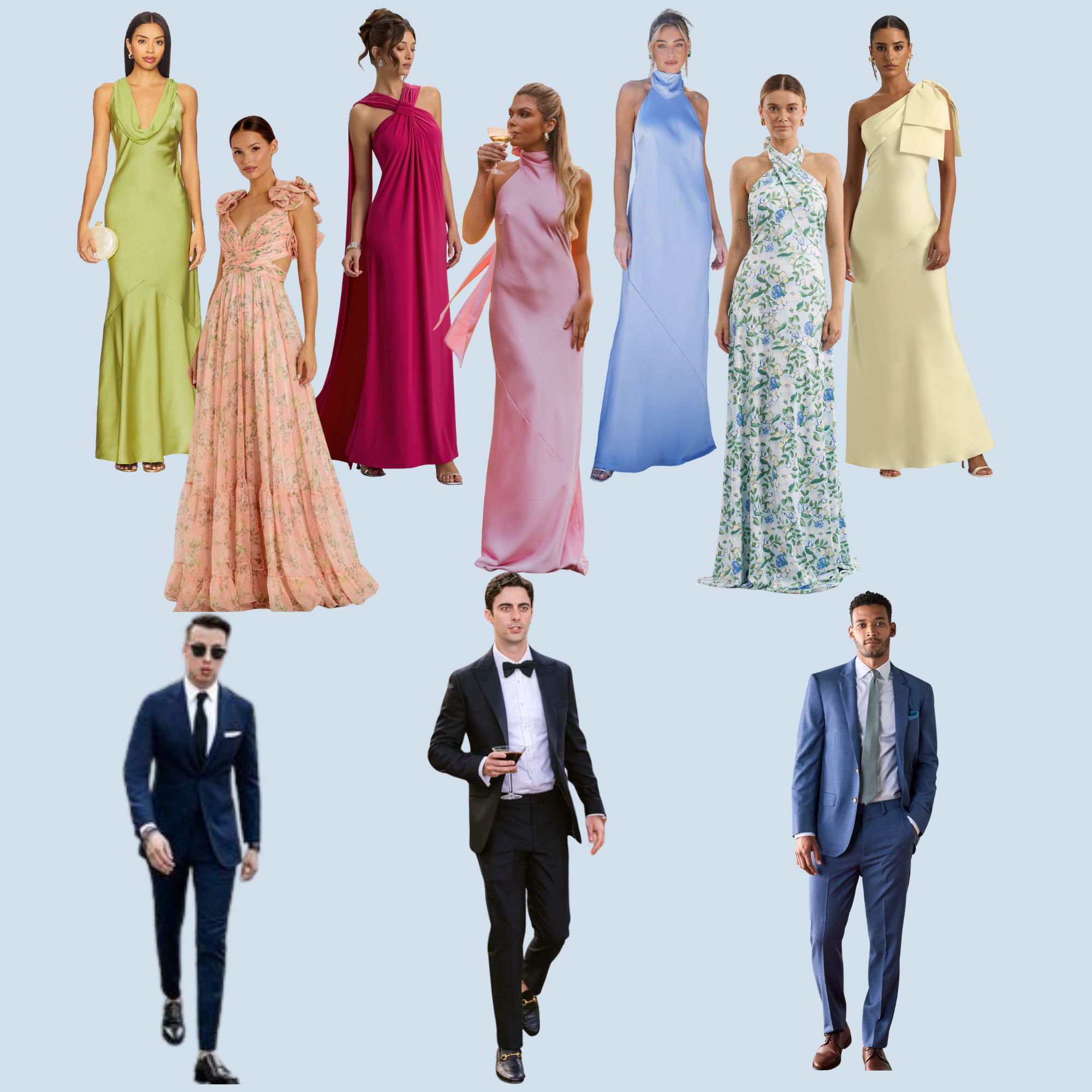 Please note: the bridesmaids will be wearing solid light blue dresses!