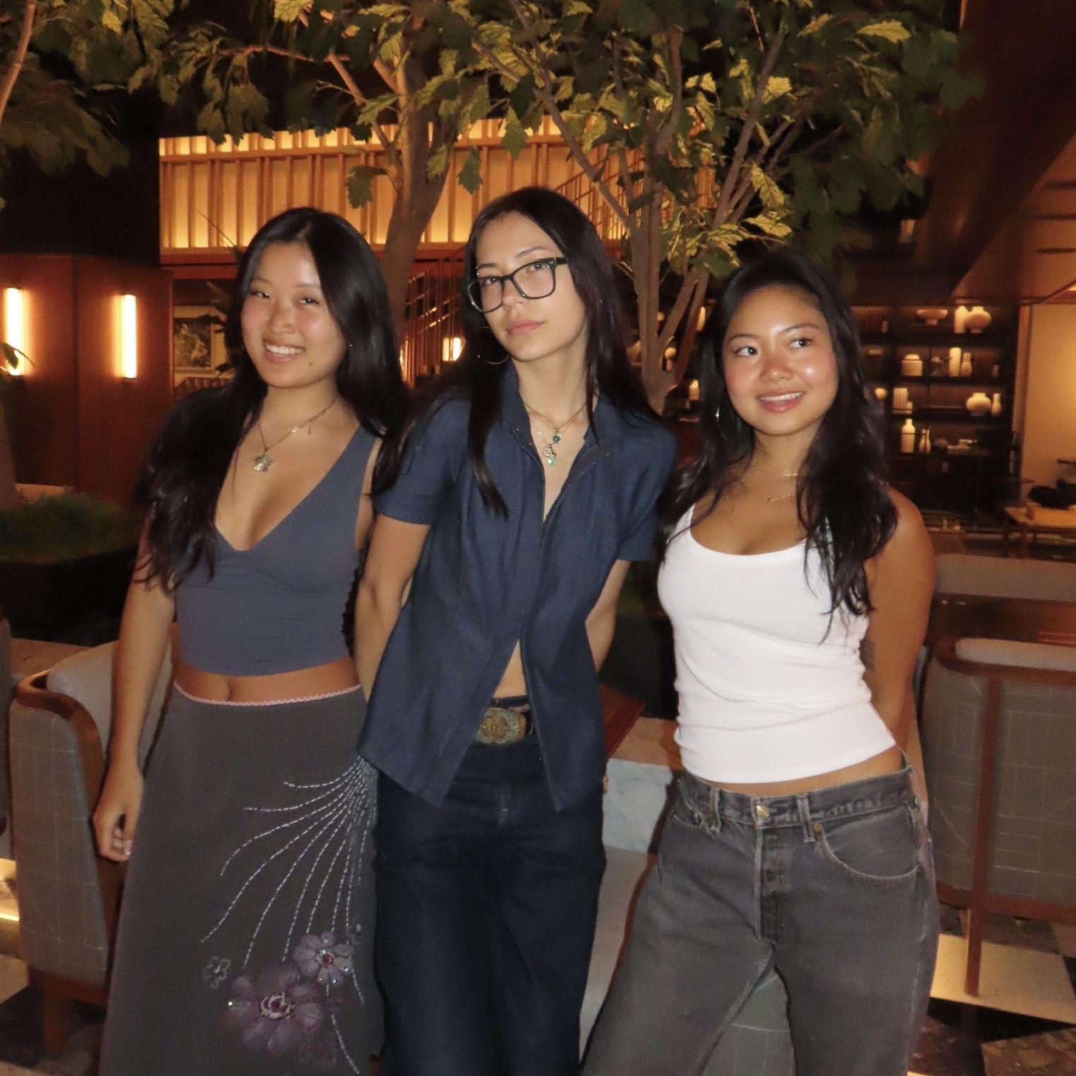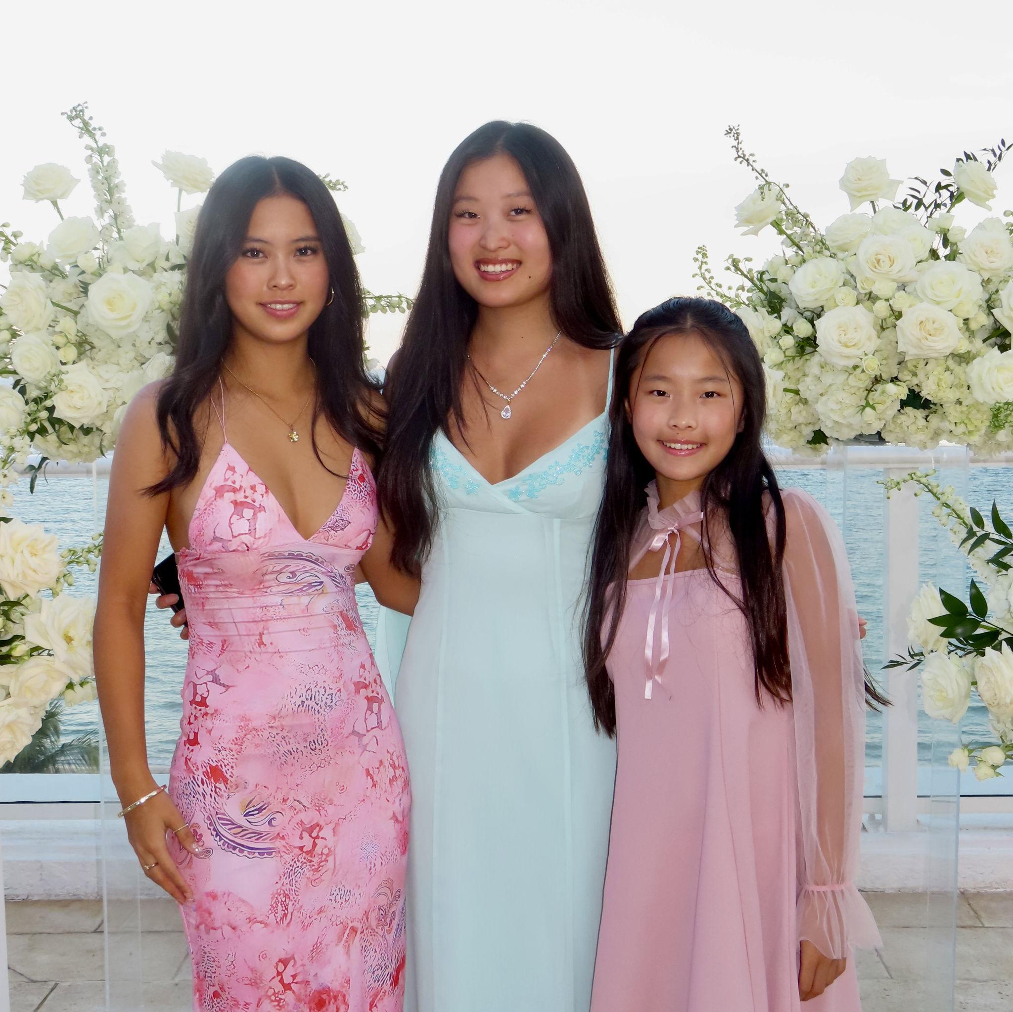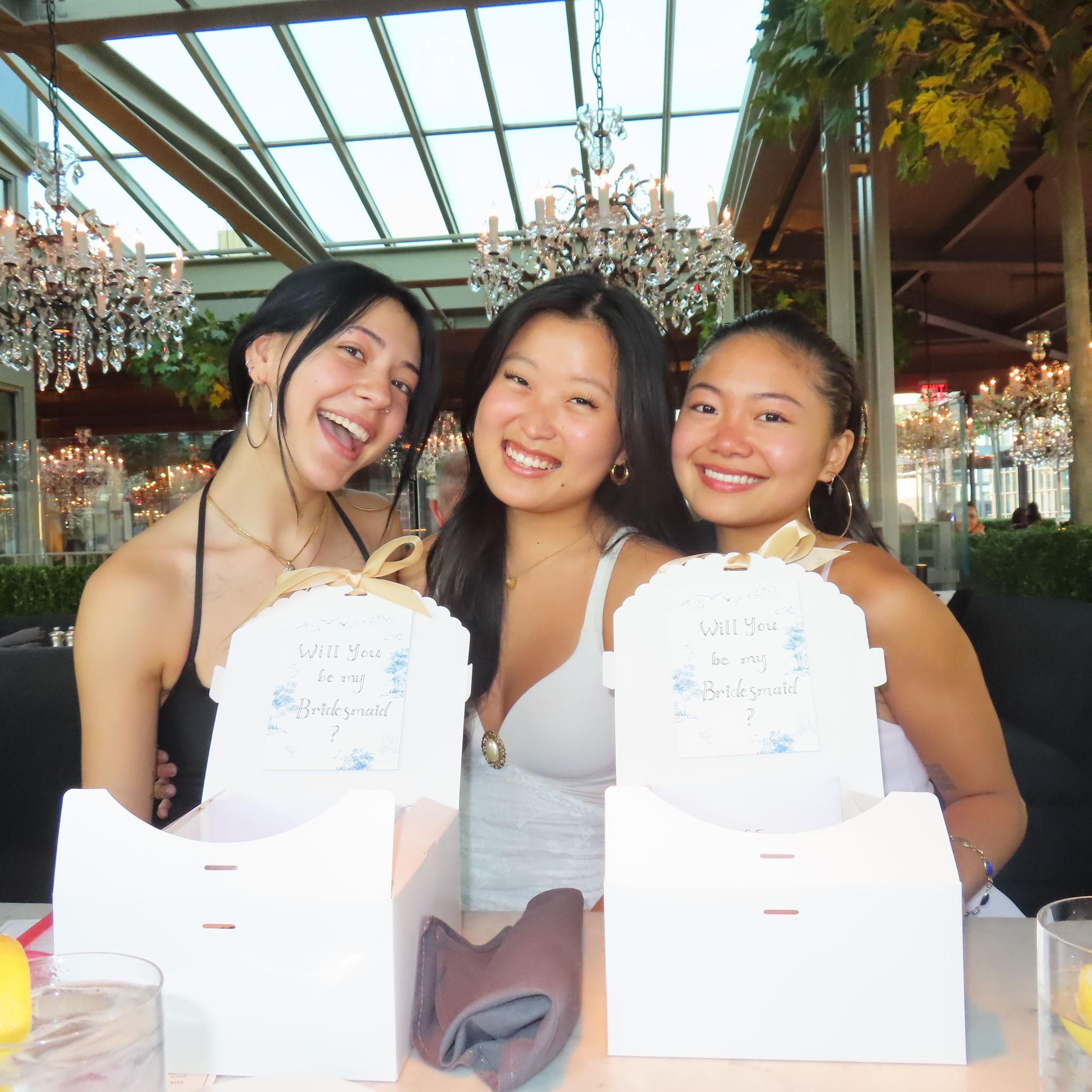 Amber and Lauren first met in Pre-K at Geneva school. They immediately became friends and wore princess dresses together at recess. It is crazy how time flies and they have now went from princess dresses to shopping for wedding dresses together. They would spend 4th of July together with both of their families. When Lauren moved away, they continued to keep in touch over email. They would hang out in the city, go thrifting, and catch up on everything. When Amber moved to California, Katie and Lauren surprised her for her 21st birthday. During that trip, they all talked about their dream weddings like they did at sleepovers when they were little and how they would love to have each other as bridesmaids one day. It's so exciting that the time is now here! They have such an amazing lifelong friendship and are so happy to be back in NYC together. (pictured in the middle)