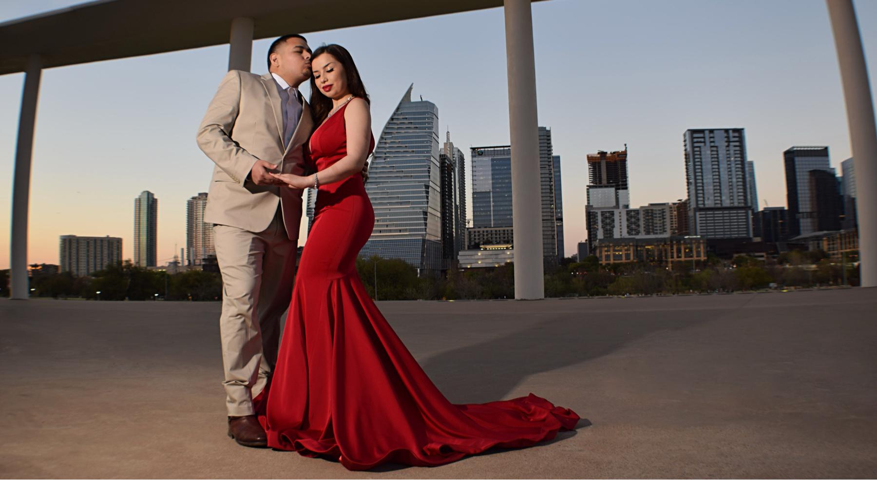 On their 7th year anniversary, Ricky proposed to Evelyn at the Zilker Botanical Garden, right in front of the waterfall. Ricky had Evelyn's family hold up rose-gold balloons that spelled, "Will you marry me?" and had some of Evelyn's close friends stand with additional balloons and flowers to witness the proposal. Ricky walked Evelyn right in front of the waterfall, Ricky shared a few words as to why he loves Evelyn and wants to spend the rest of his life with her, then Ricky got down on one knee and opened a small black box that contained the ring. Evelyn cried and said "yes!"