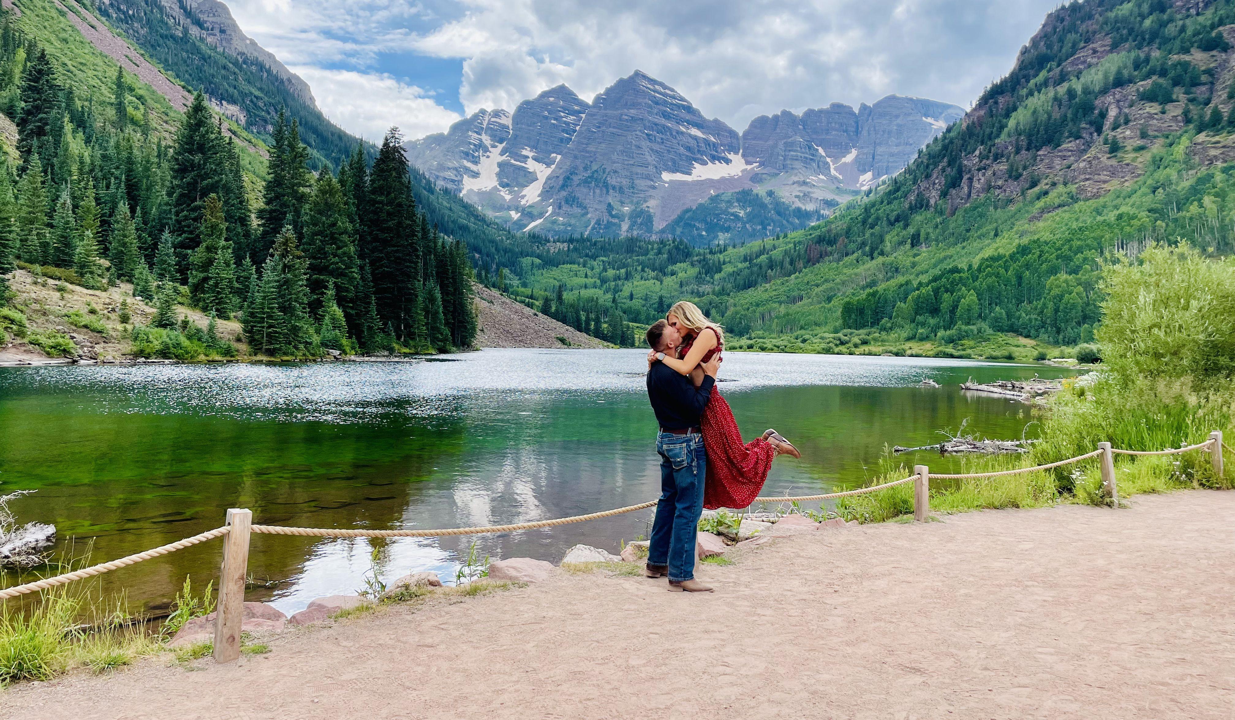 Robert planned a surprise vacation to Aspen Colorado. After a romantic gondola ride up Aspen Mountain, we traveled to Maroon Bells National Park. He said it would be an anniversary photoshoot so I set up my tripod and took photos on my phone. He told me to turn around and that he was going to take a picture of me with the scenery background. While I was looking away, he got on one knee and asked me to marry him when I turned around.