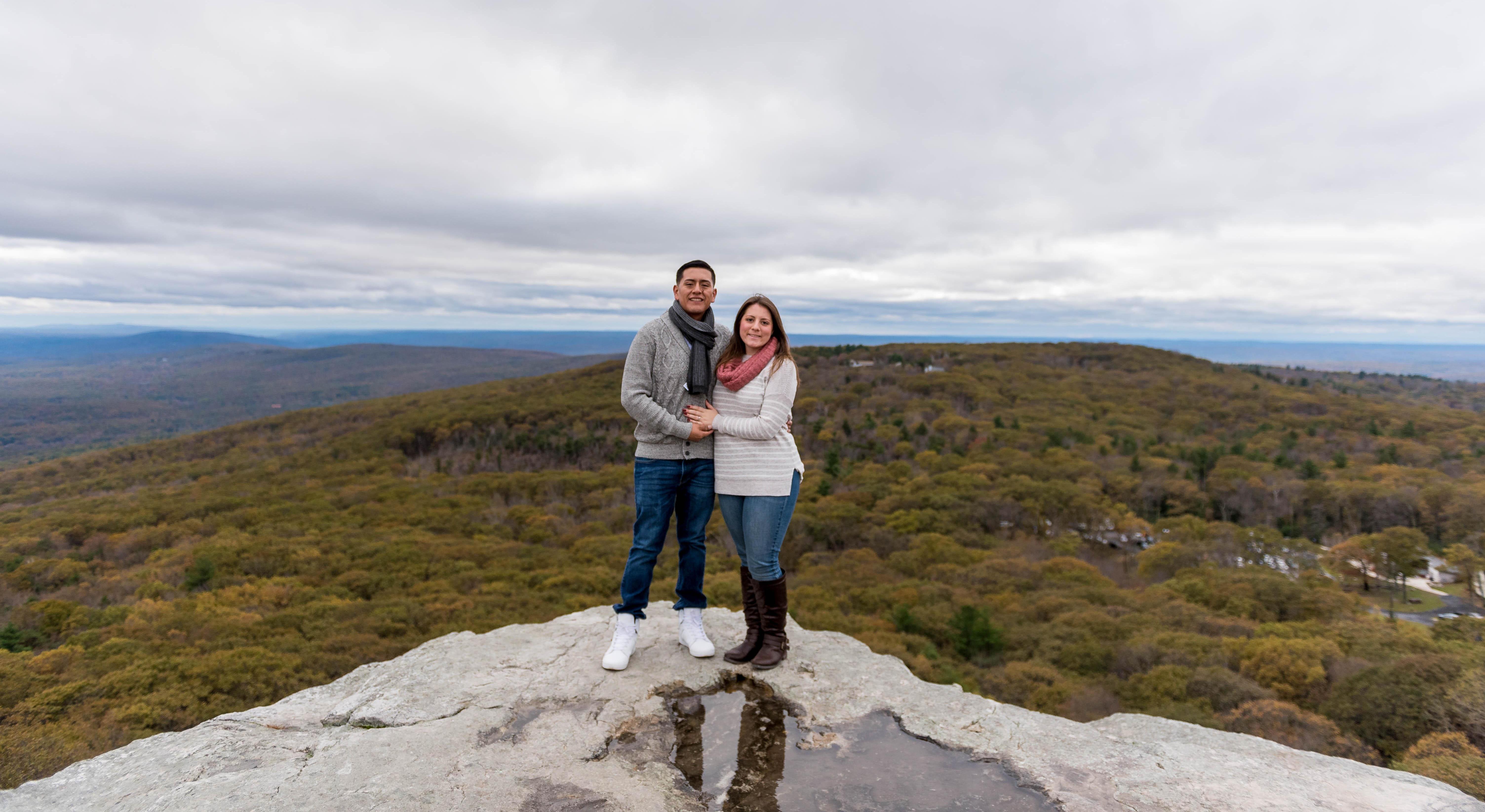 On our fifth anniversary we took a ten mile hike at Minnewaska State Park Preserve: Sam's Point Area in New York. We took pictures on cliffs, walked through ice caves, passed through waterfalls, and made it to the highest point of the mountain, and that is where we promised to grow eternally together. Although, on the way we had some speed bumps! Like our selfie stick breaking in the middle of the caves and then again at the waterfalls hah! We had a blast, and now we are looking forward to celebrating this next adventure with you!