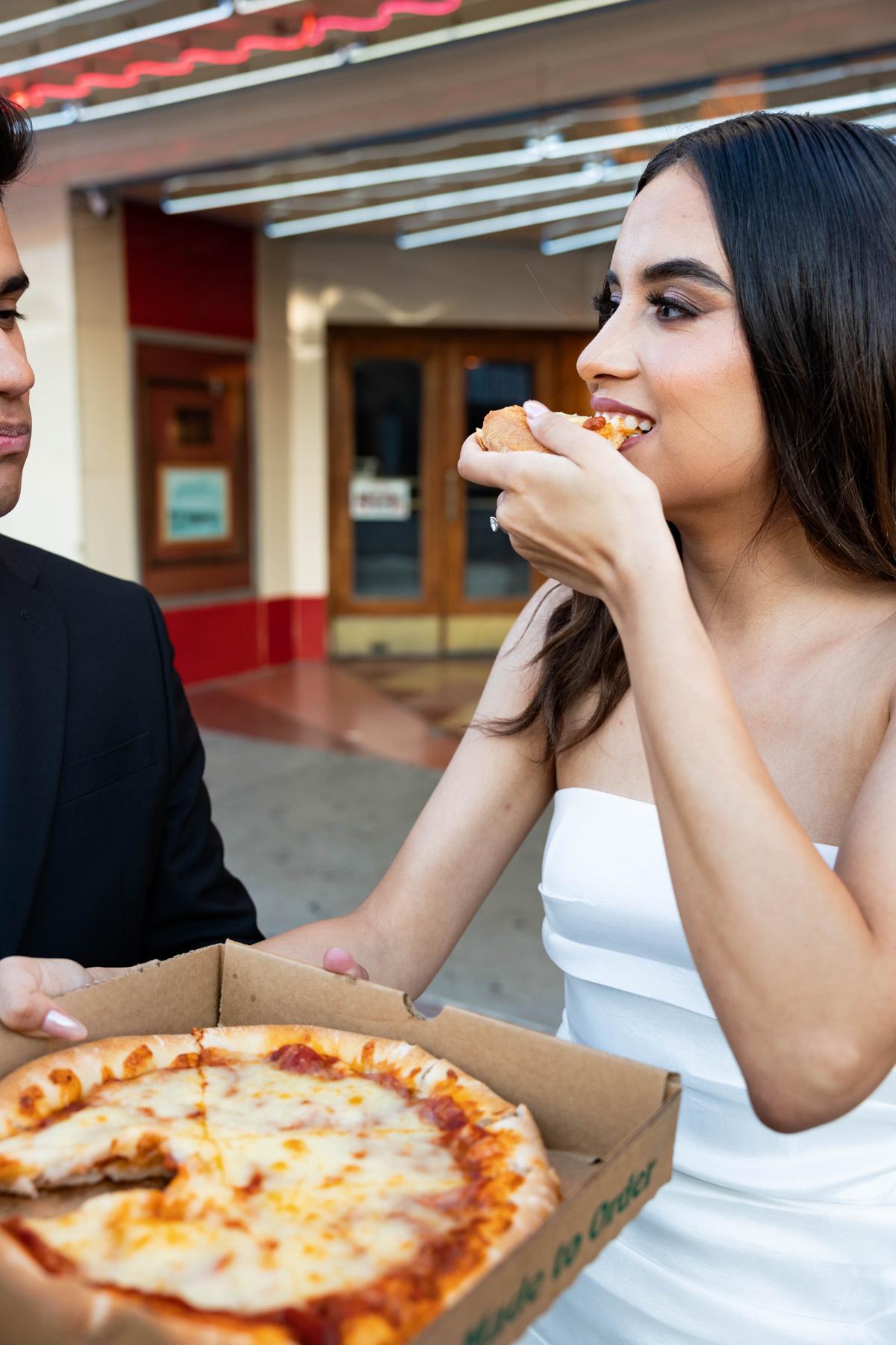 We decided to have our engagement shoot incorporate what we love to do on date night: Cinemark with a slice of pizza.