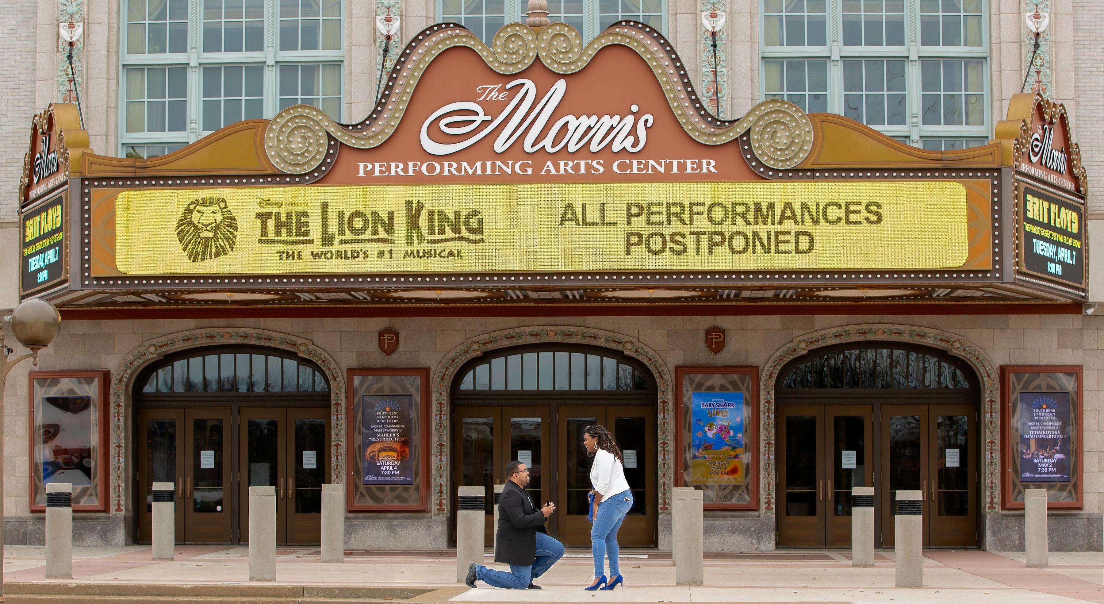 I knew I wanted to propose on March 14th for about five months leading up to that actual date. I had the idea of taking her to see The Lion King musical when it came to town. I bought tickets and even arranged for her family to come up from Louisville. Then, two days before the date the play gets canceled. Crushed, but determined, the gears started turning to make the proposal still extravagant. After consultation with my mom, I decided to use the disappointment of not seeing the play to my advantage. I told Taylor we were still getting dressed up, and we would go to one of our favorite lunch spots. Before we got to the restaurant, I told her we needed to stop by the theater to "get our refund". I parked on the side of the building so she wouldn't see anything to tip her off and before we got out of the car, I handed her tissues saying "You're going to need these,". She still had no idea what was going on. We turn the corner towards the building, and she sees her family and hears one of our pastors singing "Can You Feel the Love Tonight". And she obviously said YES! - Jonathan