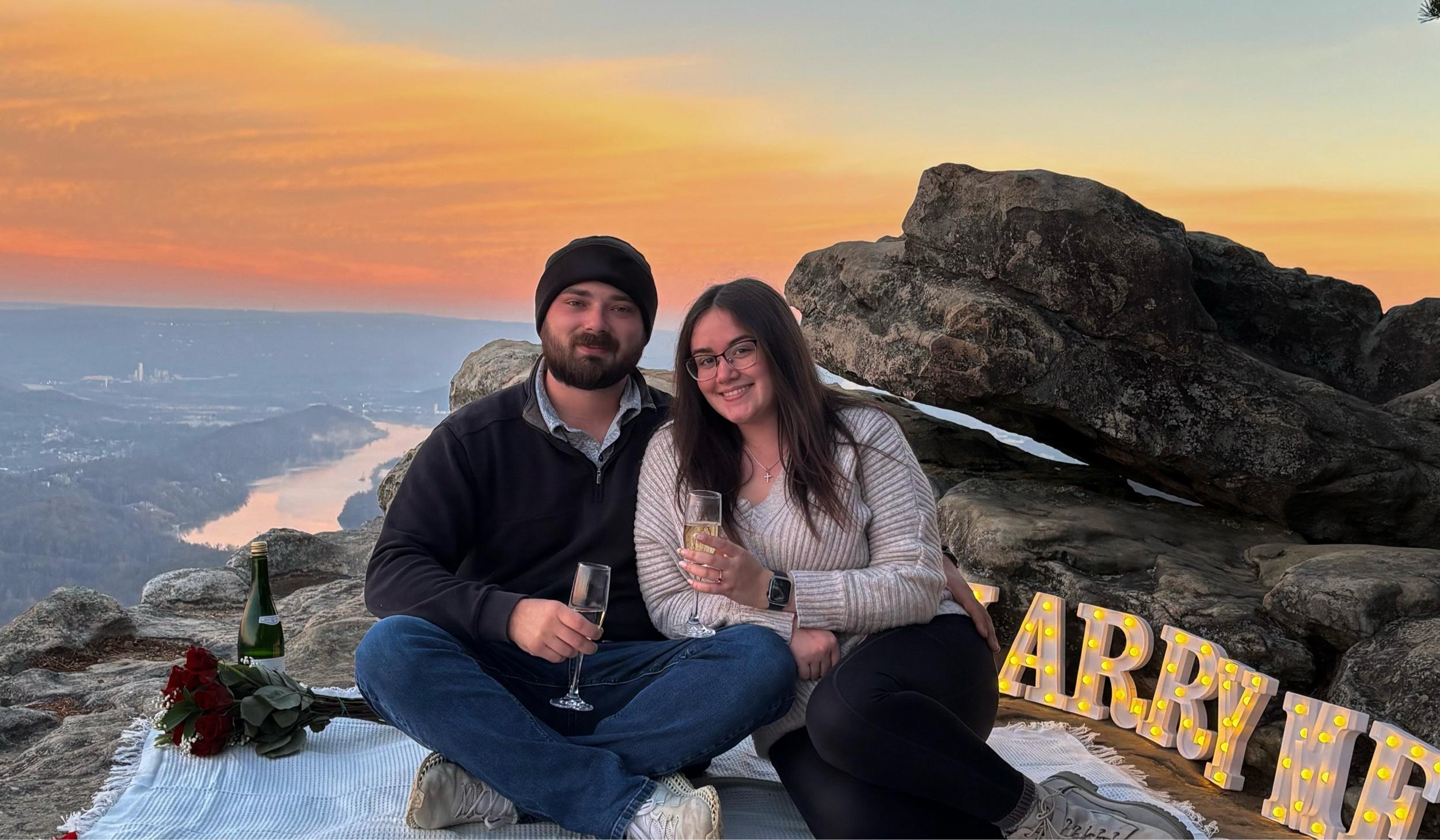On December 9, 2025, exactly one year after making our relationship official, Logan planned an early morning hike to Sunset Rock on Lookout Mountain. The plan was simple and meaningful: breakfast, a Bible study, and watching the sun rise together. With a little help from his sister, Hannah, there was a surprise waiting for us at the overlook: a blanket, roses, champagne, and a glowing “MARRY ME” sign set against the sunrise. Logan didn’t hesitate for a second and jumped right into the moment. In true real life fashion, we ended up proposing in front of the setup without realizing where Hannah’s phone was recording, so the video perfectly captures the back of Chloe’s calves and Logan down on one knee. Not exactly a cinematic angle, but absolutely on brand. Thankfully, Hannah is learning photography and managed to capture beautiful photos of the moment, proof that even when things don’t go exactly as planned, the moment itself can still be perfect.
