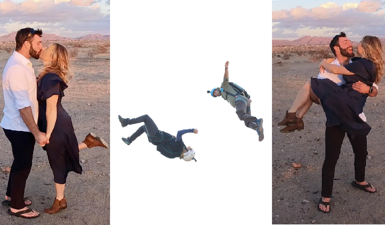Adam and Theresa first met Memorial Day weekend of 2019, at the Perrine Bridge in Twin Falls, Idaho. Adam was getting back into BASE jumping after a motorcycle accident, and Theresa was refining her BASE skills as a new jumper. After a very poor, but safe, handheld jump, Theresa landed on the opposite side of the Snake River from the landing area (she stood it up!) Adam, already in the landing area after a well-executed, textbook BASE jump, recognized she may need some assistance, grabbed a canoe that was staged in the LZ and began to paddle towards her to help her out of her predicament. The first conversation the two ever exchanged was “Hey do you need a ride?” “No!!” After this response Adam quickly turned the canoe around and left her to figure out her situation. Theresa, frustrated at her performance and wanting to solve the problem she had created on her own, proceeded to pack up her parachute and climb the underside of the bridge back to the correct side of the Snake River. Adam watched her climb out from the hiking path and immediately took notice of this tiny, stubborn, blonde chick. While he found Theresa to be slightly stand-offish (“you cool guyed me” as he puts it) and Theresa thought Adam was slightly cocky, out of shape and probably couldn’t do the gainers he kept talking about, the two exchanged Instagrams anyways and stayed in touch via the app. Smash cut, 2022, they reunited at the Arizona BASE boogie and the 22 Jumps Camelback event in Phoenix, Arizona. Both fresh off breakups and after a jump filled weekend, they exchanged numbers to keep in touch. Adam, taking the initiative, called Theresa on the drive home. The true tell of where the relationship was headed was when Theresa invited Adam to join a group on a ultralight BASE jumping trip and he immediately said yes, after already saying no to John Lavan and Chris Carnahan who invited him on the same trip. On that trip Theresa learned Adam was still cocky, but quite skilled at BASE jumping, smart, and very sweet. Adam learned that Theresa was intelligent, funny, kind and independent. Theresa proceeded to vet Adam for a few more weeks, and after getting a big thumbs up from family and close friends, the two finally started dating, and the rest is history!