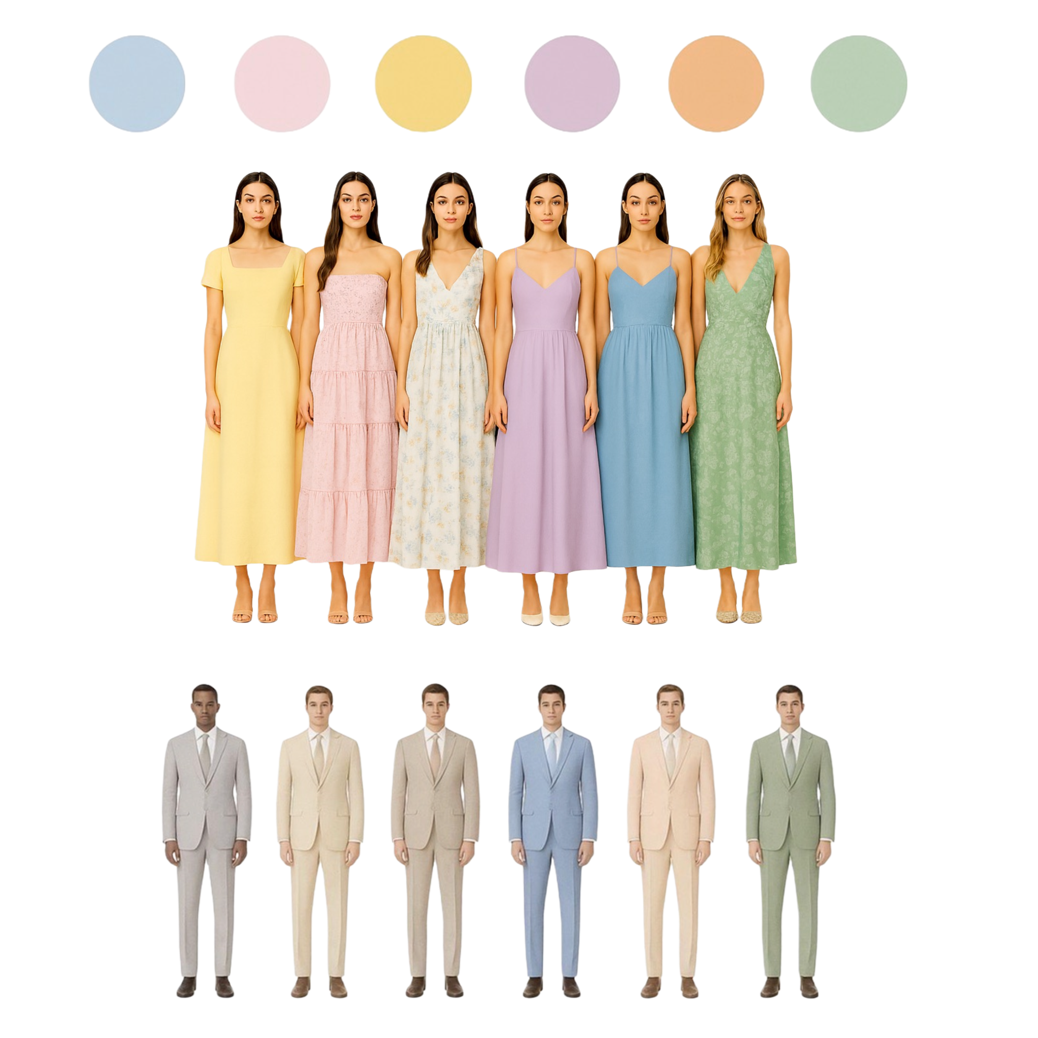 The theme is spring pastels/florals. Women please do not wear all white, black, shorts, or jeans. Men do not wear shorts, jeans, or black.
