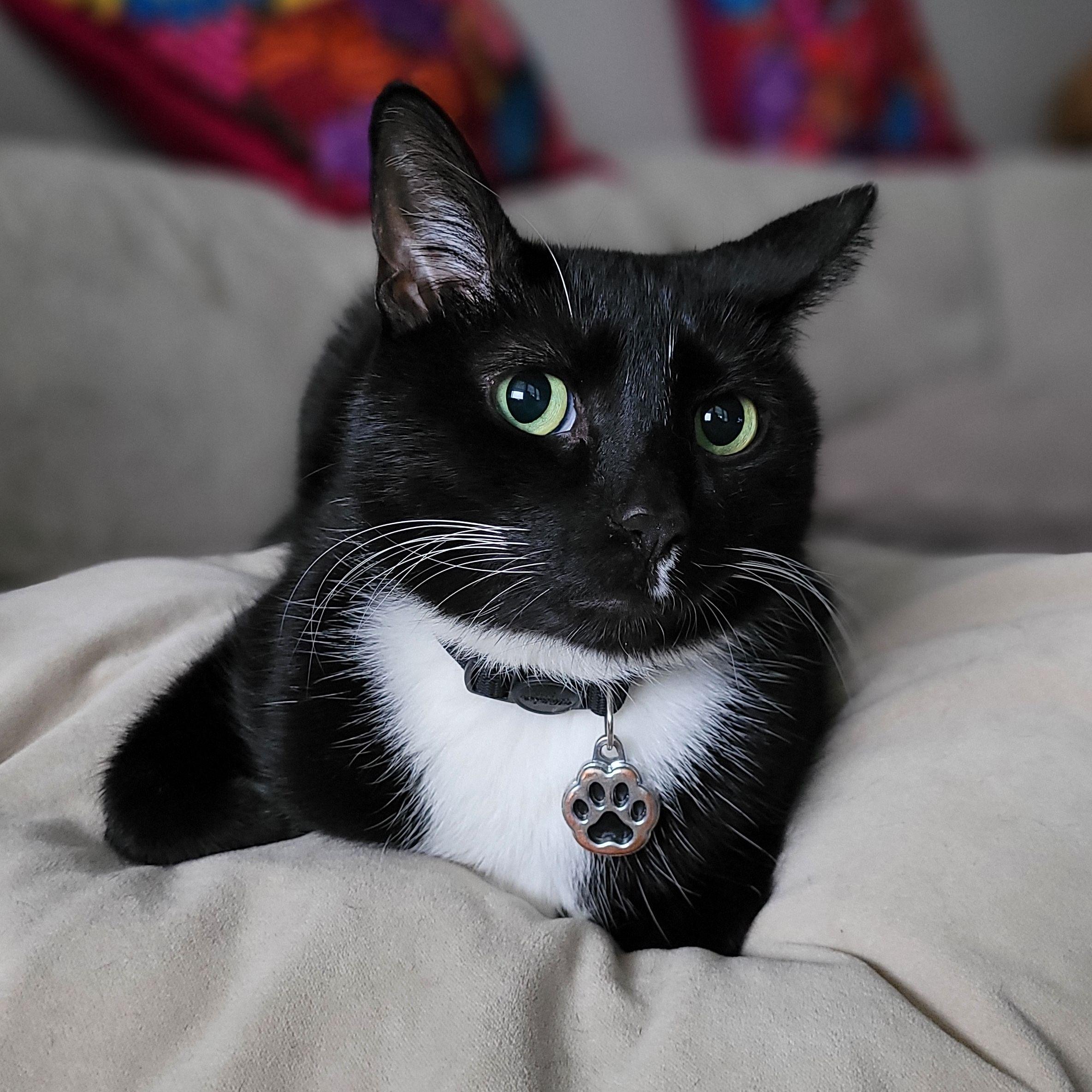 In 2017, Linda was roommates with her friend from high school named Jessica. One night, Jessica and her boyfriend (now husband) Alex were driving home from a wedding. When they got off of the expressway, they noticed cars swerving. Turns out they were swerving because there was a kitten in the middle of the street! Alex got out of the car, rescued the kitten and took it back to the apartment. They all tried to give the kitten food and water. When it was time for bed, Linda put a box next to her bed so the kitten could sleep there. He kept meowing so she brought him onto the bed with her. And that was it, she was in love! Linda feels so happy that Chokis found her. En 2017, Linda vivia con su su amiga de la secundaria llamada Jessica. Una noche, Jessica y su novio (ahora esposo) Alex iban manejando a casa después de una boda. Cuando salieron de la autopista, notaron que los carros se desviaban. ¡Resulta que se estaban desviando porque había un gatito en medio de la calle! Alex salió del carro, rescató al gatito y lo llevó de regreso al departamento. Todos intentaron darle comida y agua al gatito. Cuando llegó la hora de acostarse, Linda puso una caja al lado de su cama para que el gatito pudiera dormir allí. Él siguia maullando, así que ella lo dejo dormirse en su cama. ¡Y eso fue todo, estaba enamorada! Linda se siente tan feliz de que Chokis la haya encontrado.