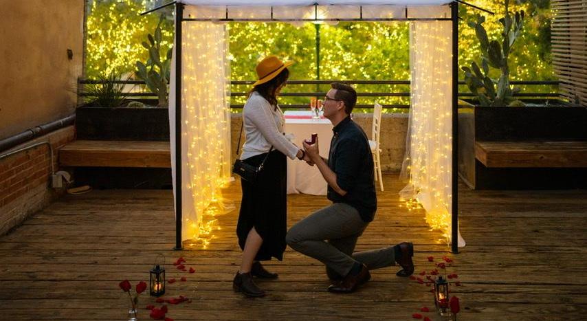 Anabel: I thought Jake was out of town working. My girlfriends and I were gonna have a photoshoot downtown and then grab some dinner (they tricked me into dressing up). When we got to the restaurant, all the workers were being weird and awkward, but I was still pretty oblivious as to what was going on. One of my friends suggested that we go to the rooftop, but me being awkward was bent on staying downstairs. Finally, they convinced me that we should go upstairs and when I opened the door, Jake was standing there. Our song was playing and there was a beautiful flower pedal runway that led to a white canopy. Our pictures were hung up on the walls; everything looked so perfect! We talked for a bit (I was shocked he was in town) and then he started giving his very sweet romantic speech. He said some words in English. He said some words in Spanish. I cried. He asked me if I wanted to marry him, I said yes, and then he replied, “Are you sure?” And I said, “YES!” Jake: I asked Anabel to marry me. She said “yes”. Here you are