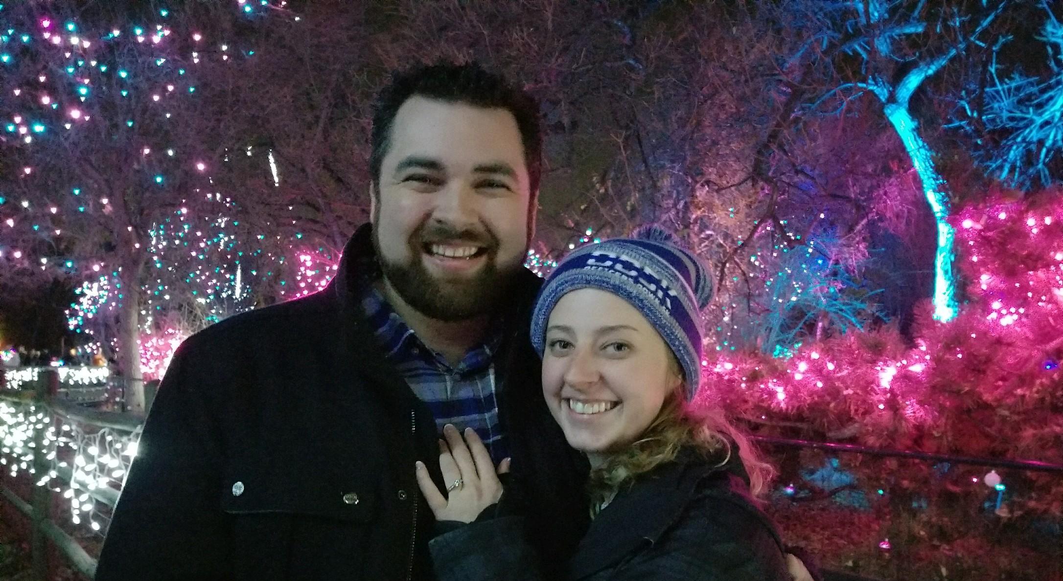 On Thanksgiving I had to work but my family had invited Jon to come over for the holiday. He took this opportunity to become a part of my family and also ask my dad for permission to marry me. Monday, 11/27/17, I got my cast off. So Jon told me to keep Saturday 12/2/17 free so that we can celebrate and have a date day. The gun show was in town and I had picked out a scope for him that I wanted to get him for his birthday. So we agreed that we should go to the gun show that morning and then go to the Museum and check out the new exhibits, then in the evening go to dinner at a new taco place. I thought that because the museum and the zoo were so close that it would be a great idea to also go to the zoo lights. Little did I know he had already purchased tickets to the zoo light's for 12/2/17 as a surprise for me. I pressed him to go to zoo lights and each time he told me that it would be too much to do in one day and neither of us wanted to be rushed. Friday my sister Valerie called me to go get our nails done. Saturday was a great day at the museum! We went to a taco place near the museum for dinner and it was delicious. After we ordered he told me he had a surprise, and pulled out the tickets to zoo lights! I was so excited and couldn't wait to go see the lights. Behind the scene...... Jon had planned the proposal around the beginning of the week. He wanted it to have a false summit type of proposal so he wanted the zoo to be the surprise so I didn't see the proposal coming. He asked his friend on Friday to go to the zoo to take pictures of the proposal, and asked my sister to invite me to get my nails done. He had picked out a beautiful tree lit up with white sparkling lights. He asked some people to take a picture of us at which time he asked if I was happy. I turned to him confused and said of course I am. He got down on one knee and asked me to make him the happiest man in the world. I was speechless and so excited. Caught completely by surprise!