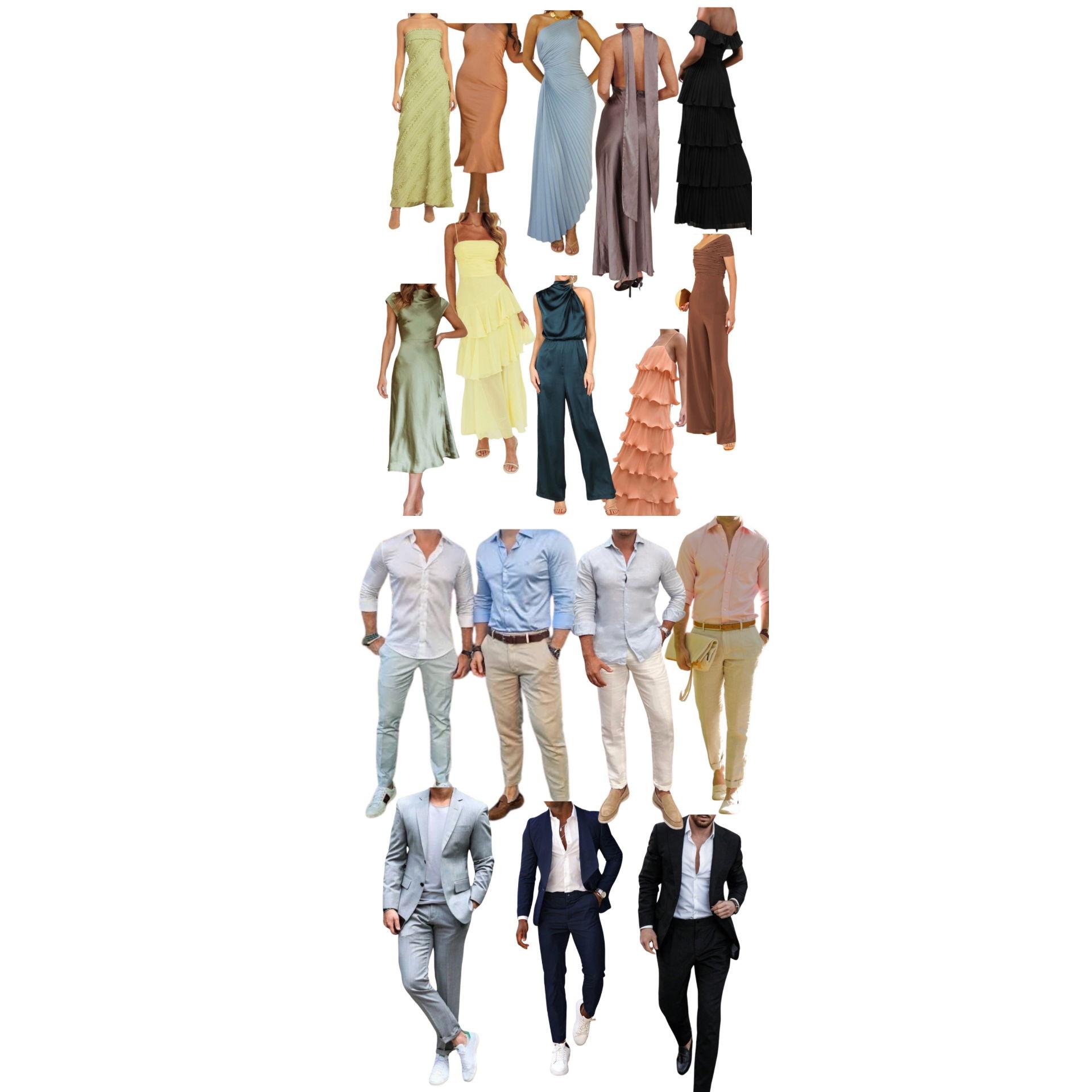 We kindly request that all of our guests wear cocktail attire for our wedding. Options for men may include a button-up shirt with dress pants or a suit. For women, a midi dress, floor-length dress, or jumpsuit/pantsuit. Please avoid jeans, shorts, flashy patterns, bright colors, and of course no wearing white. A few example pictures are provided below.