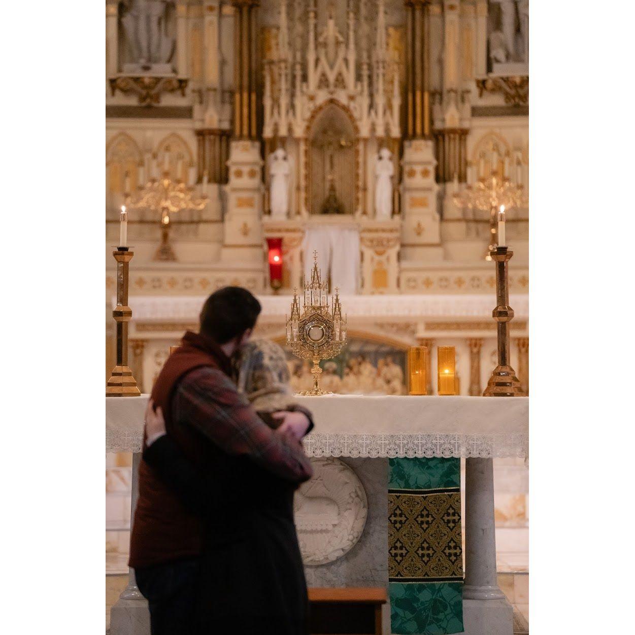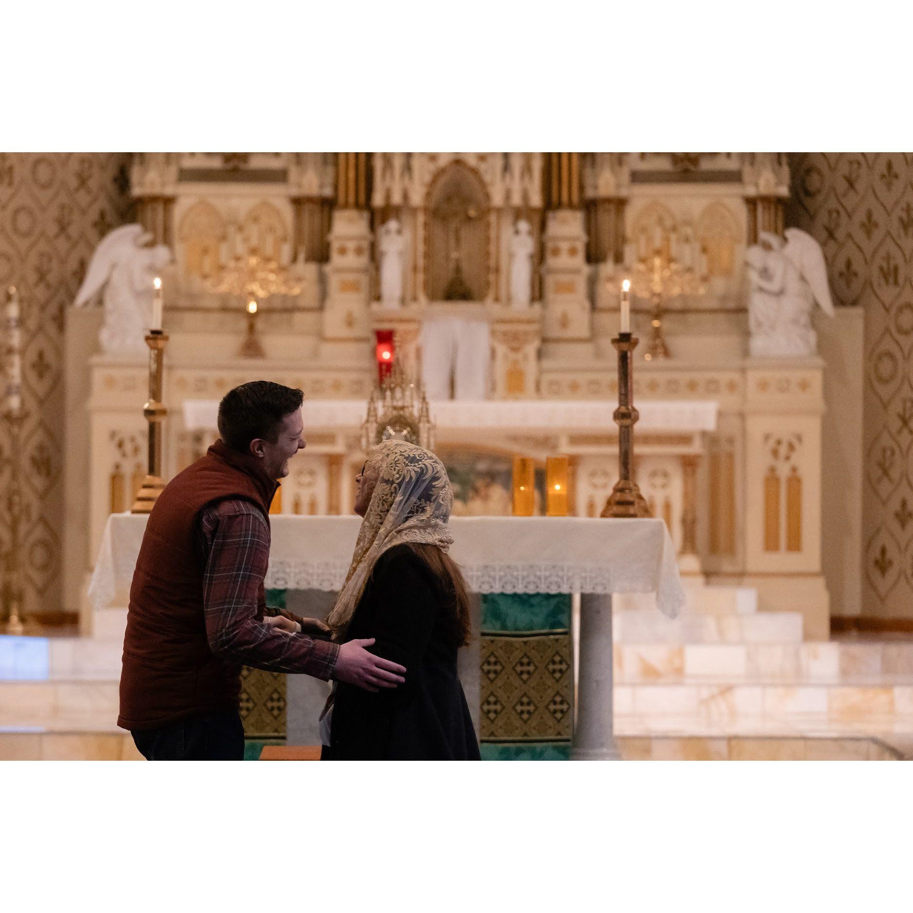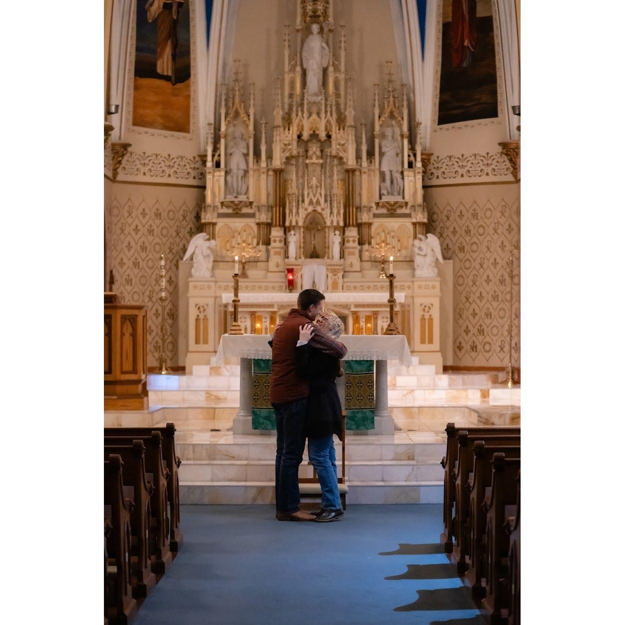 Jarett ensured that our engagement started off right, proposing in Allison's childhood church in front of Jesus in the Blessed Sacrament!