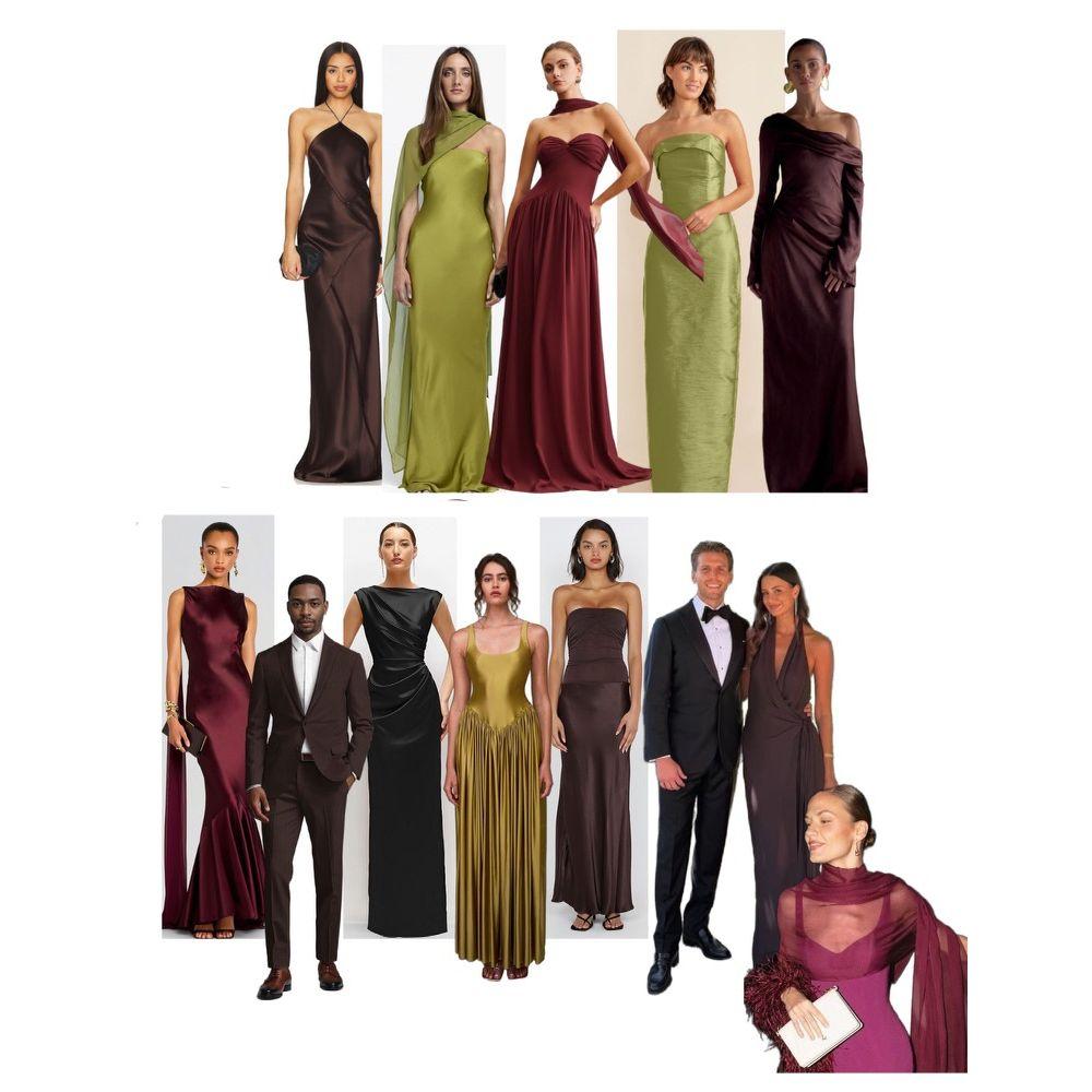 DRESS CODE: Formal attire in rich wine tones, olive greens/chartreuse, and warm neutrals like dark espresso brown. Think elegant, earthy, and romantic. Floor-length dresses or suits are encouraged. See photo for color inspiration.