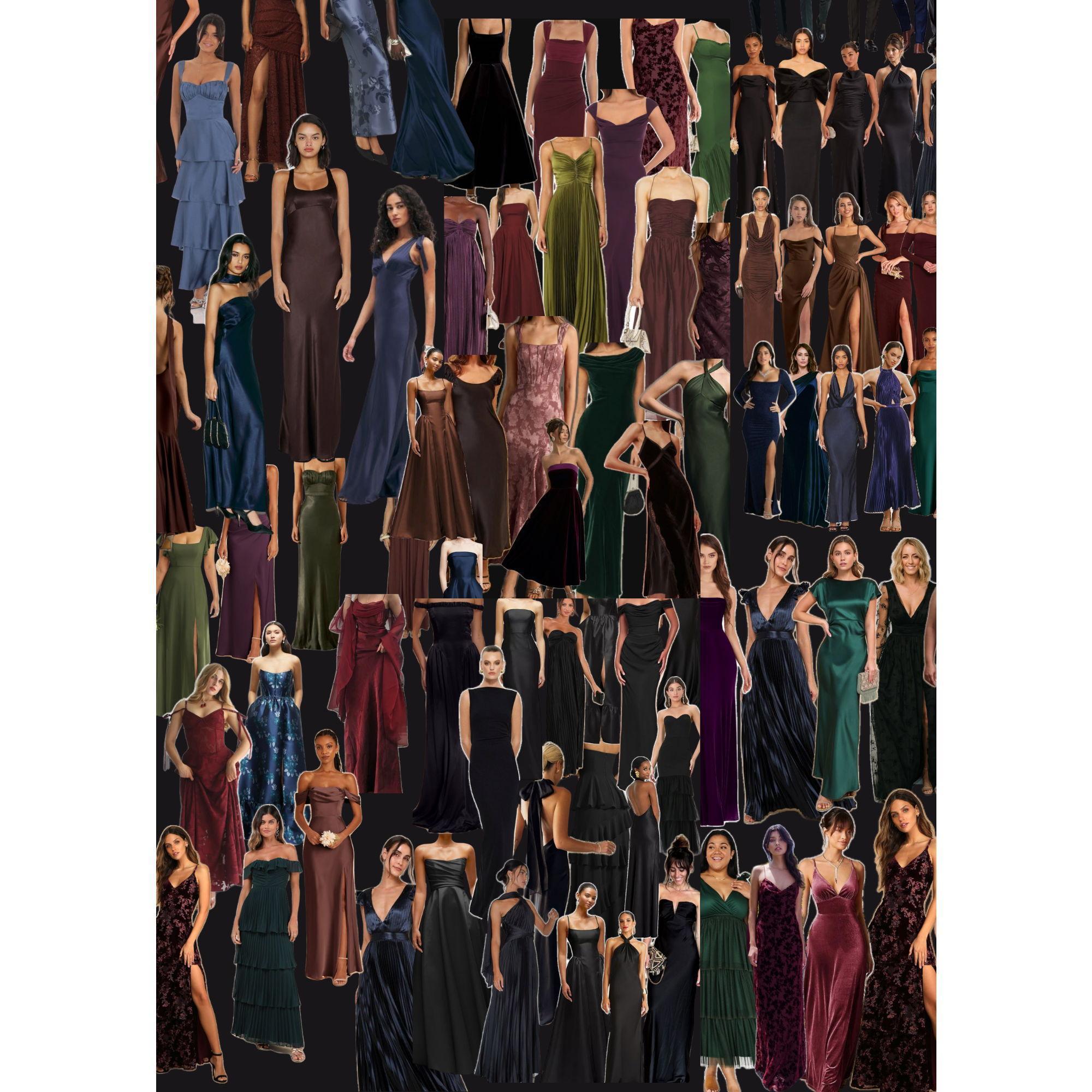 For the ladies: Dark, moody tones in jewel-inspired shades work beautifully. Think elegant gowns or mid length dresses.