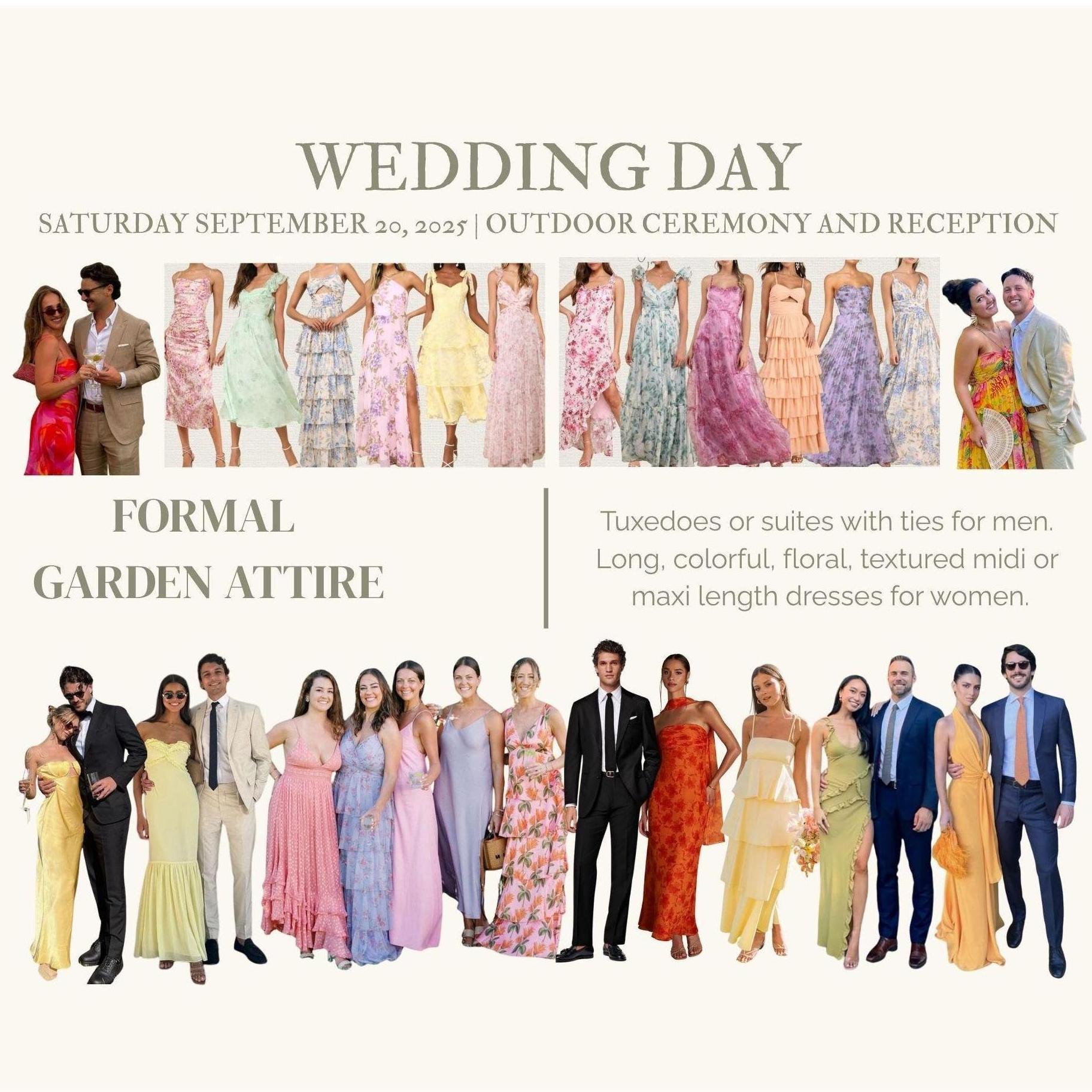 Here you will find all of the details to help you pick and plan for our wedding! Below is the dress code, color palette, and inspiration. We cannot wait to celebrate with you!